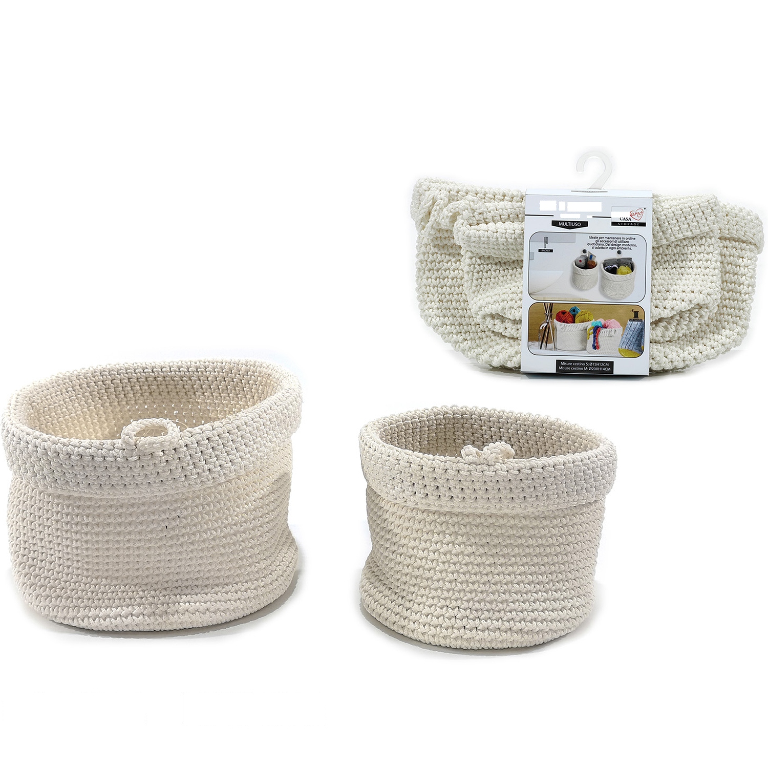 Σετ δύο στρογγυλών καλαθιών από βαμβάκι σε λευκό χρώμα, με διάμετρο 15/20 εκατοστά και ύψος 20 εκατοστά. Ιδανικά για χρήση σε διάφορους χώρους του σπιτιού.