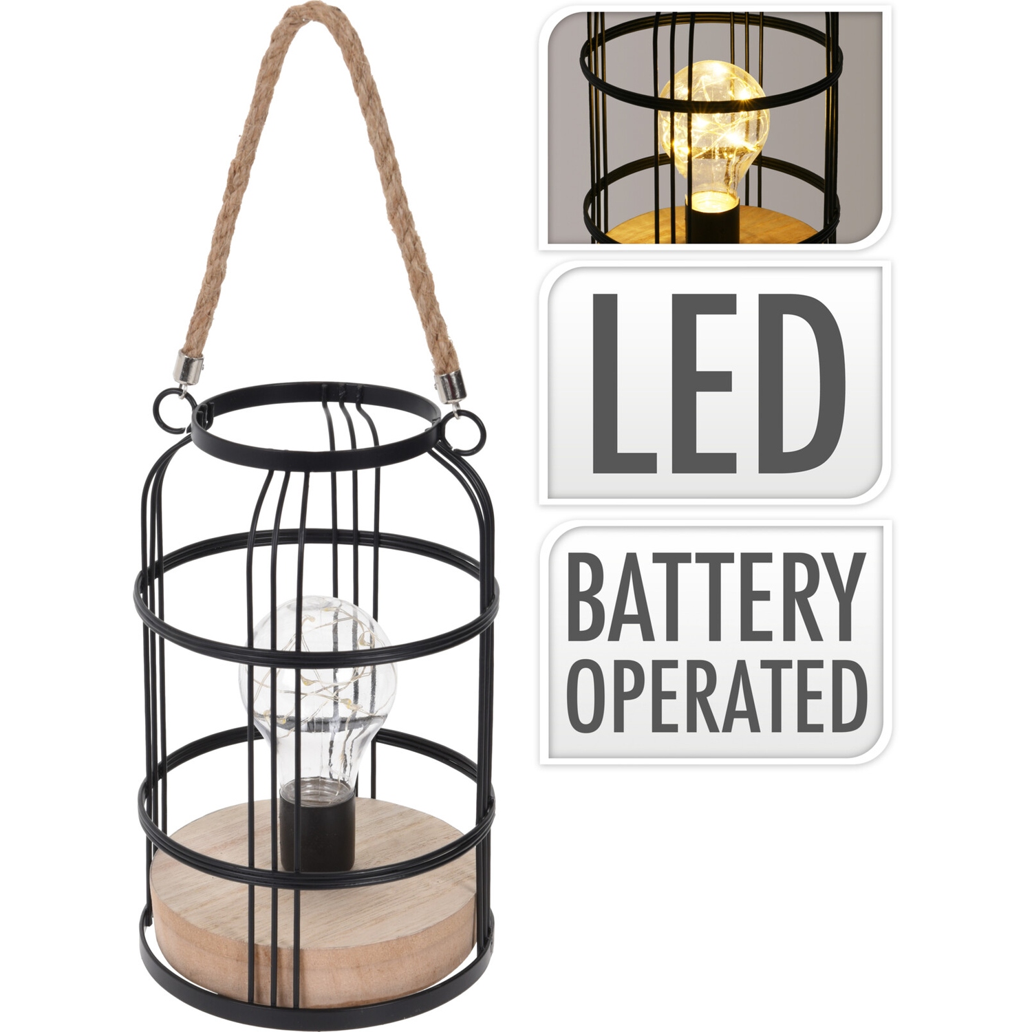 Φανάρι με λαβή από σχοινί λάμπα LED μπαταρίας μαύρο μέταλλο/MDF 13x13x20cm.