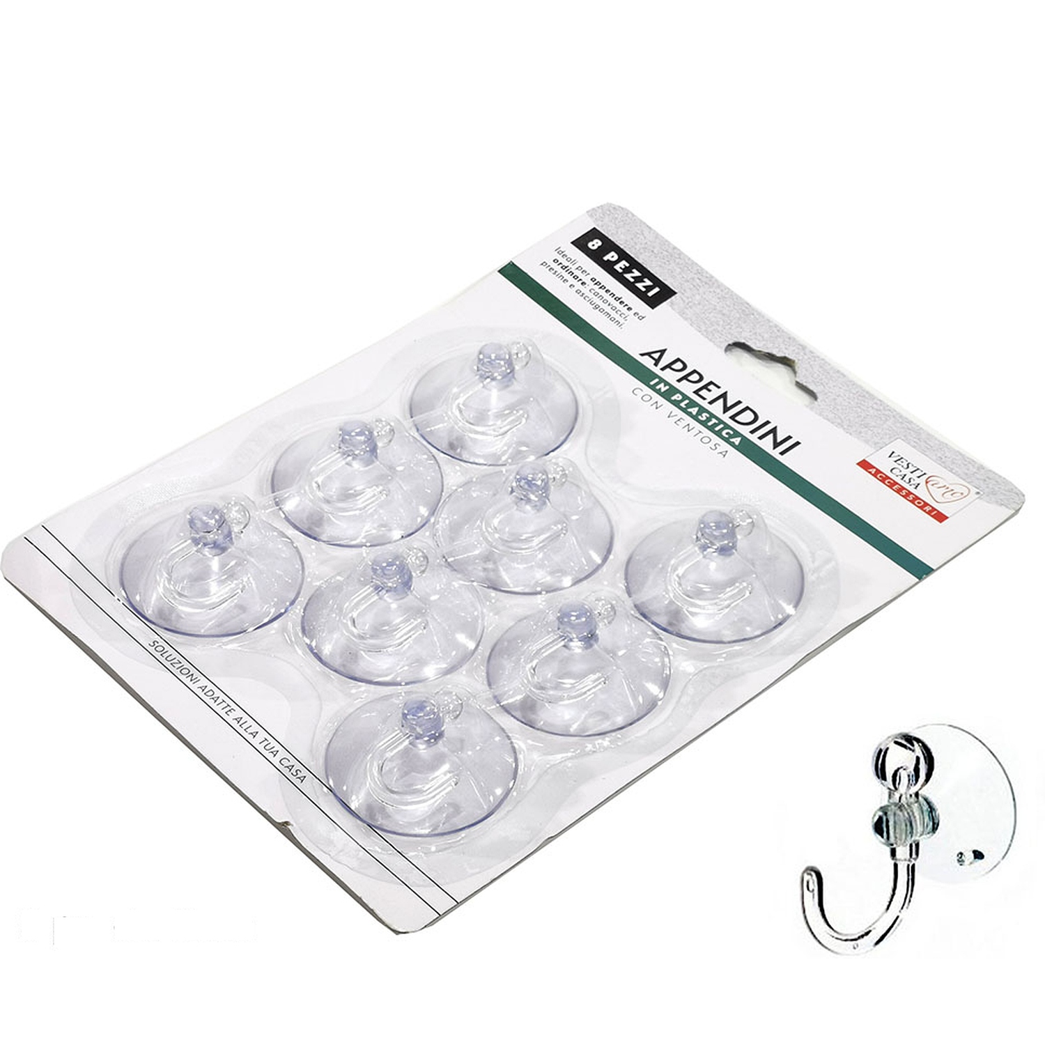 Εύχρηστο σετ 8 πλαστικών γάντζων βεντούζας, ιδανικό για την οργάνωση και τον εξοπλισμό του σπιτιού σας. Κατάλληλο για επιφάνειες όπως κεραμικά πλακάκια και γυαλί.
