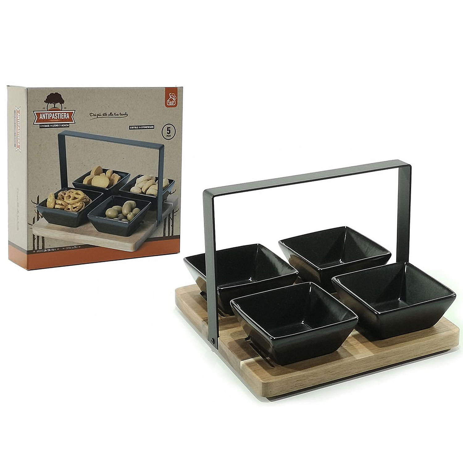 Δίσκος σερβιρίσματος με μεταλλική λαβή και 4 δοχεία 8x8cm φυσικό/μαύρο ξύλο/κεραμικό 20x20x14cm.