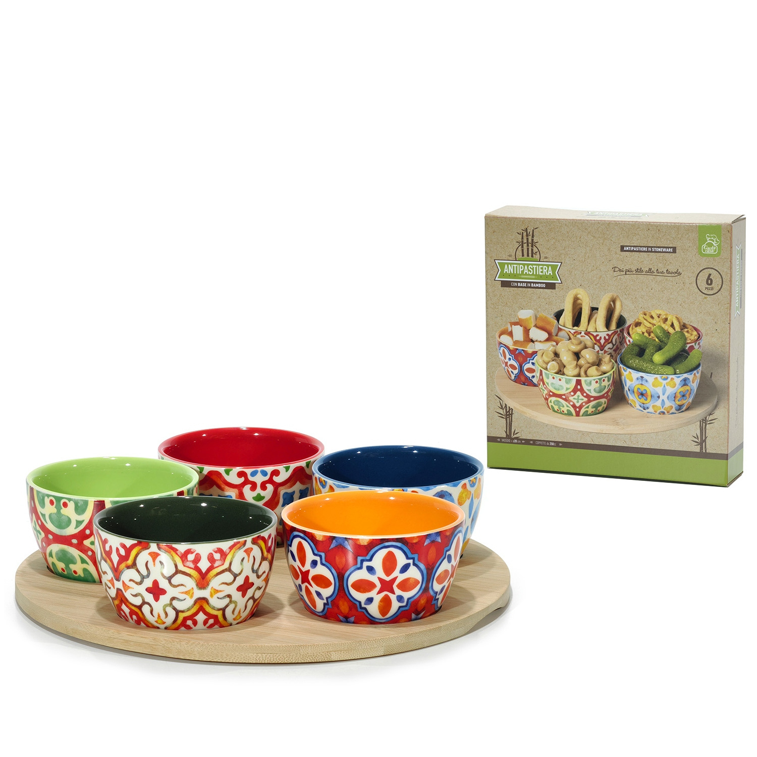 Δίσκος Σερβιρίσματος Ορεκτικών Με 5 Δοχεία Φ10cm Πολύχρωμο Κεραμικό/Μπαμπού Φ28cm