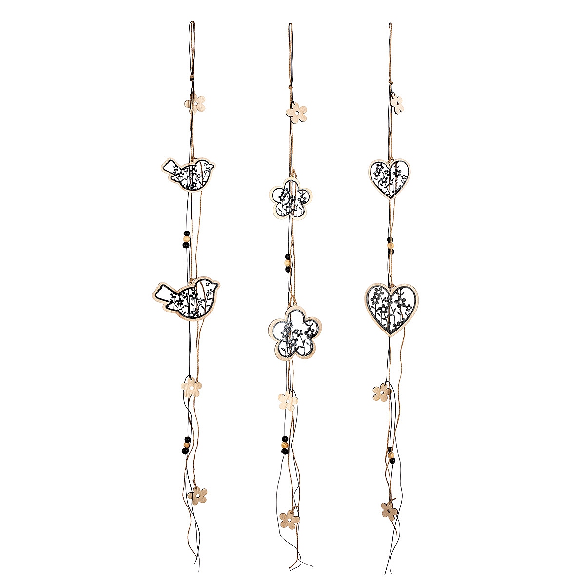 Διακοσμητικό κρεμαστό πουλί/τριφύλλι/καρδιά φυσικό/μαύρο ξύλο/σχοινί 1x11x85cm σε 3 σχέδια.