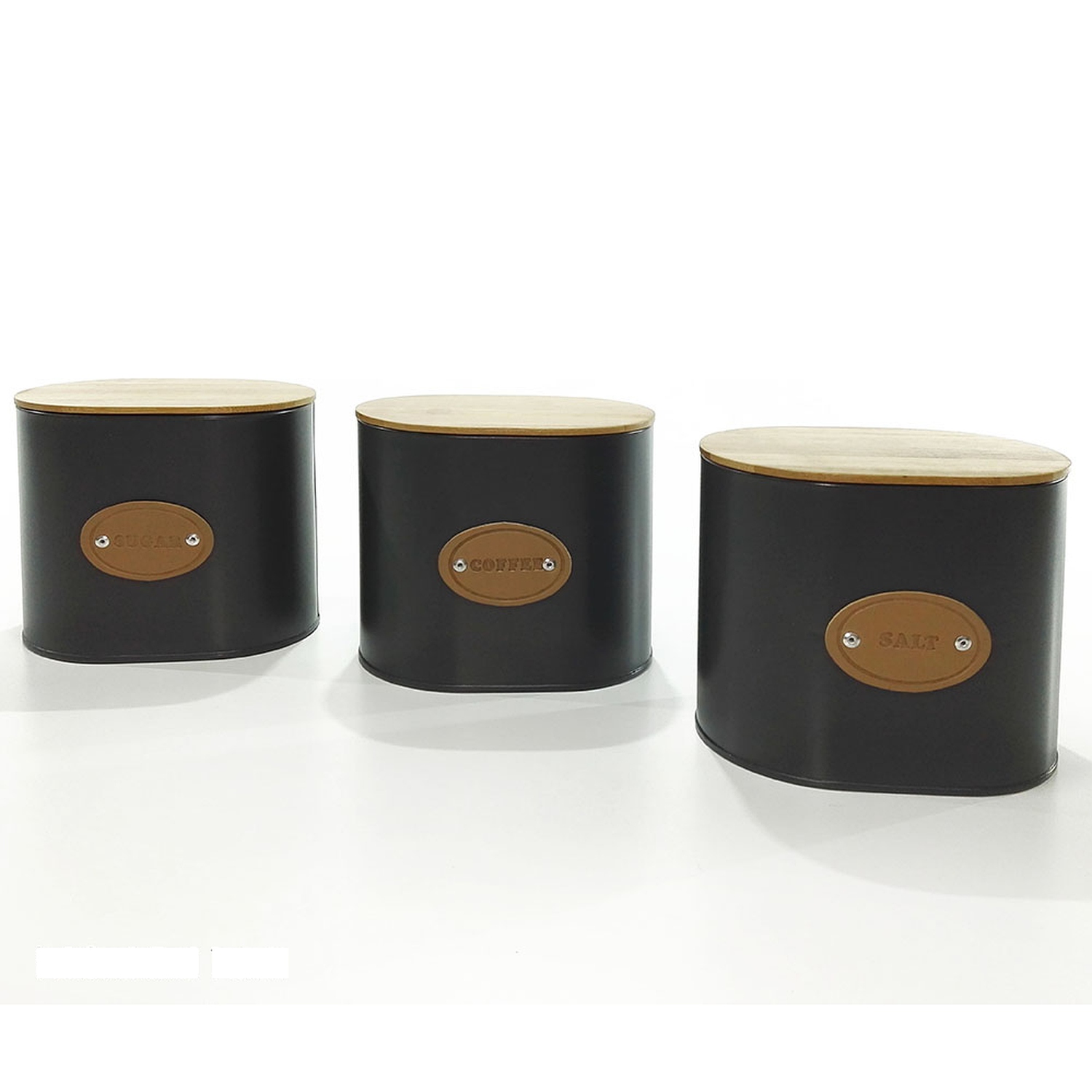 Σετ από δοχεία με καπάκι ξύλου ιδανικές για αποθήκευση καφέ, ζάχαρης και αλατιού. Το κομψό σχεδιασμό τους με μαύρο και γκρι μεταλλικό φόντο θα ταιριάξει άμεσα με κάθε κουζίνα.