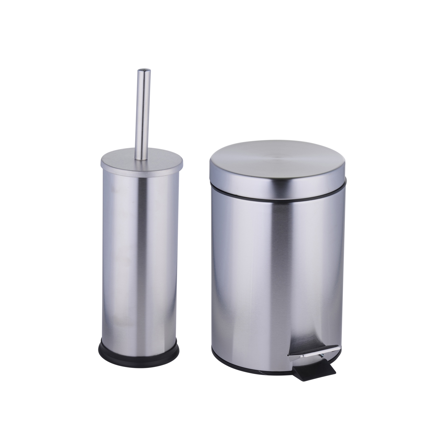 Το σετ περιλαμβάνει κάδο πεντάλ 3L και βούρτσα τουαλέτας, κατασκευασμένα από ανοξείδωτο ατσάλι. Ιδανικό για να διατηρείτε το μπάνιο σας καθαρό και οργανωμένο.