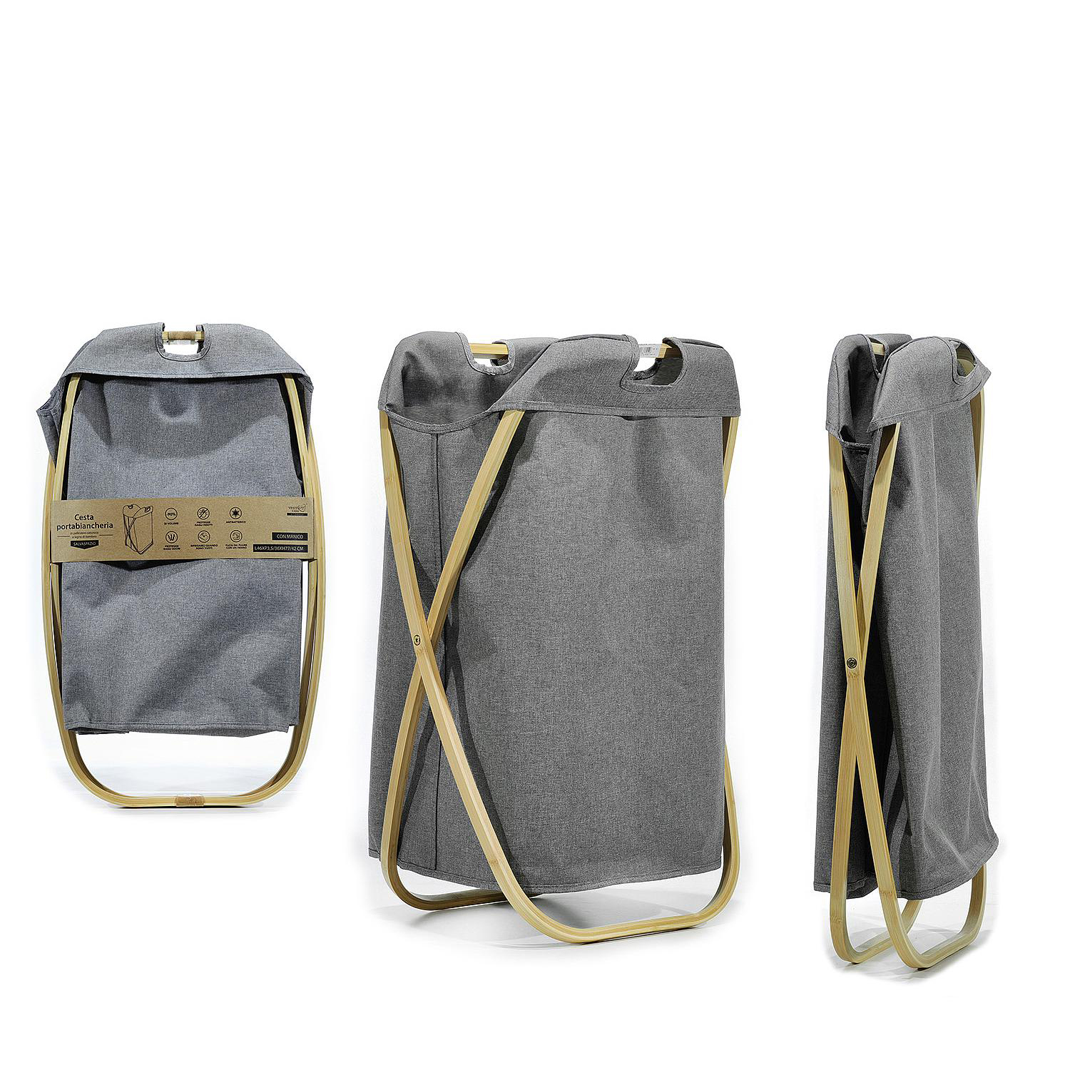 Καλάθι απλύτων πτυσσόμενο με polyester 600D θήκη γκρι/φυσικό ύφασμα/ξύλο 46x36x72cm.
