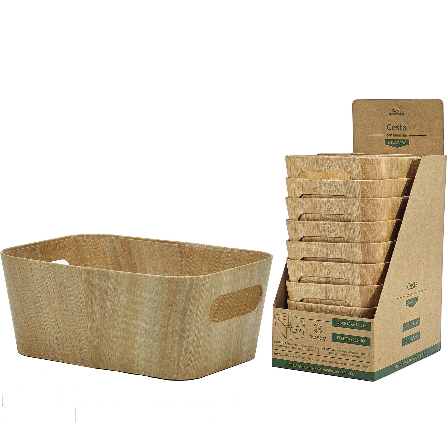 Φυσικό καλάθι ιδανικό για αποθήκευση, κατασκευασμένο από πλαστικό με επένδυση από ανακυκλωμένο χαρτί που θυμίζει ξύλο. Άριστη επιλογή για την εξοικονόμηση χώρου με στυλ.