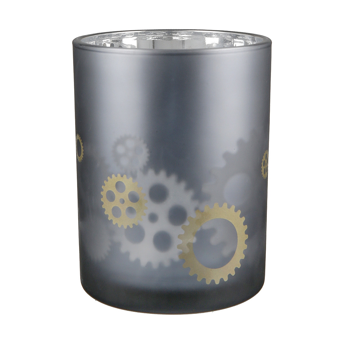 Κηροπήγιο με διακόσμηση γρανάζια γκρι γυαλί Φ10×12.5cm.