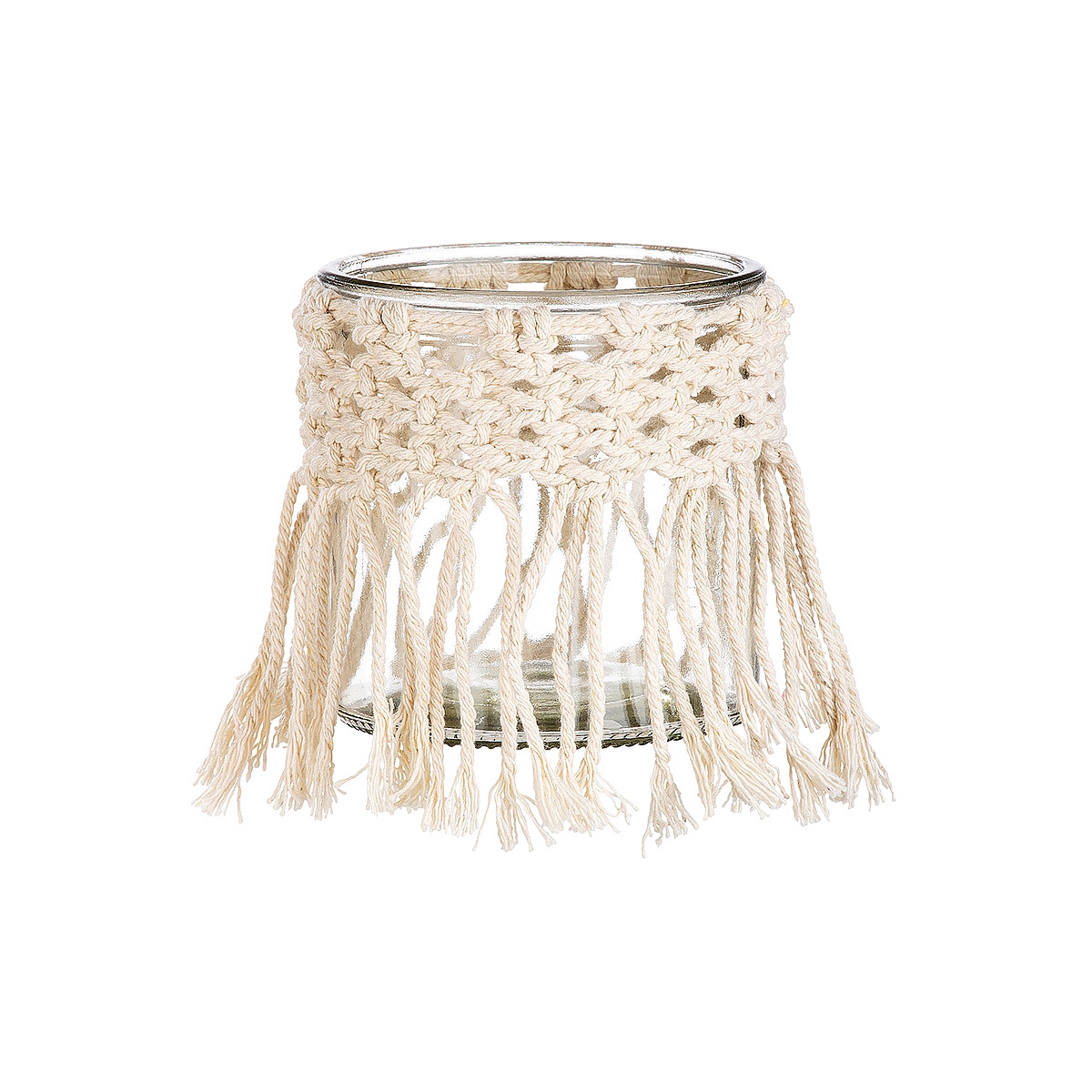 Κηροπήγιο με μακραμέ διακόσμηση διάφανο/μπεζ γυαλί 10x10x10cm.