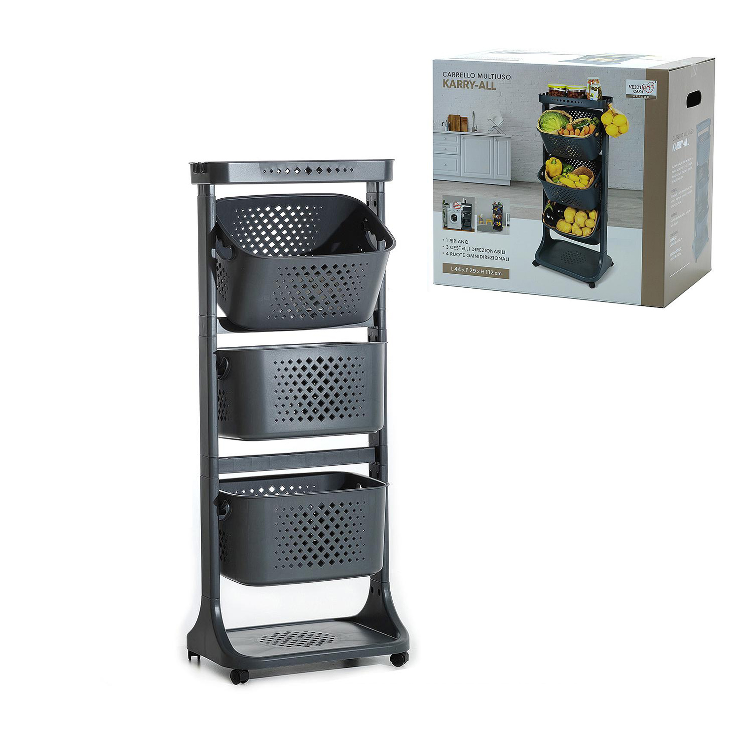 Μανάβης τρόλεϊ με 3 καλάθια γκρι πλαστικό 44x29x112cm.