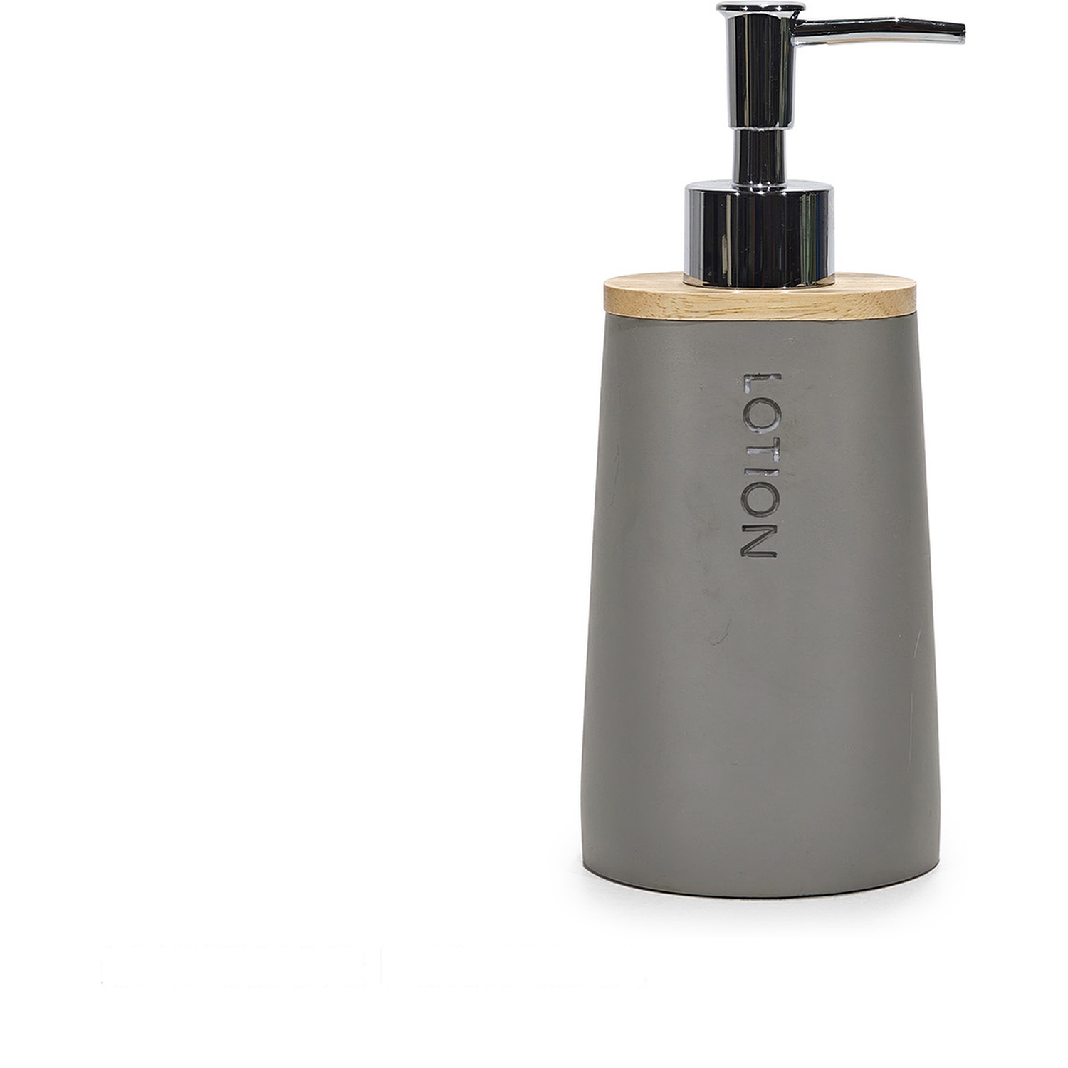 Διανεμητής σαπουνιού με κομψό γκρι σχέδιο, κατασκευασμένος από πολυρεζίνη και μπαμπού. Ιδανική προσθήκη για μοντέρνα μπάνια.