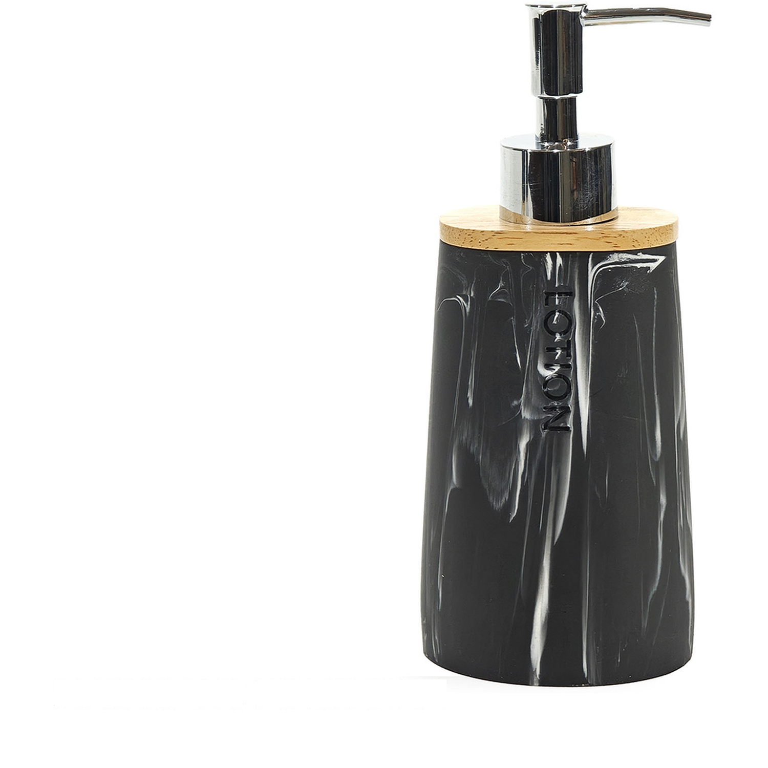 Κομψός διανομέας σαπουνιού σε μαύρο χρώμα με απομίμηση μάρμαρου, κατασκευασμένος από πολυρητίνη, ιδανικός για κάθε μπάνιο.