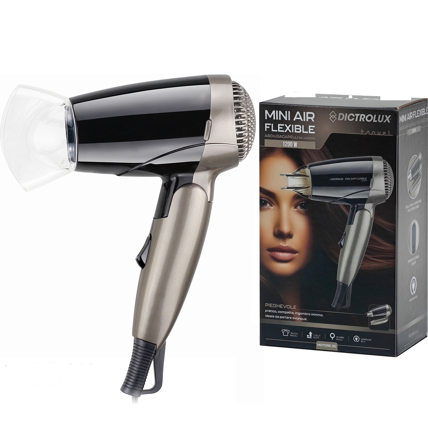 Το MINI AIR FLEXIBLE είναι ένα φορητό πιστολάκι μαλλιών με ισχύ 1200W, σχεδιασμένο για ευέλικτη χρήση κατά τη διάρκεια των ταξιδιών σας.
