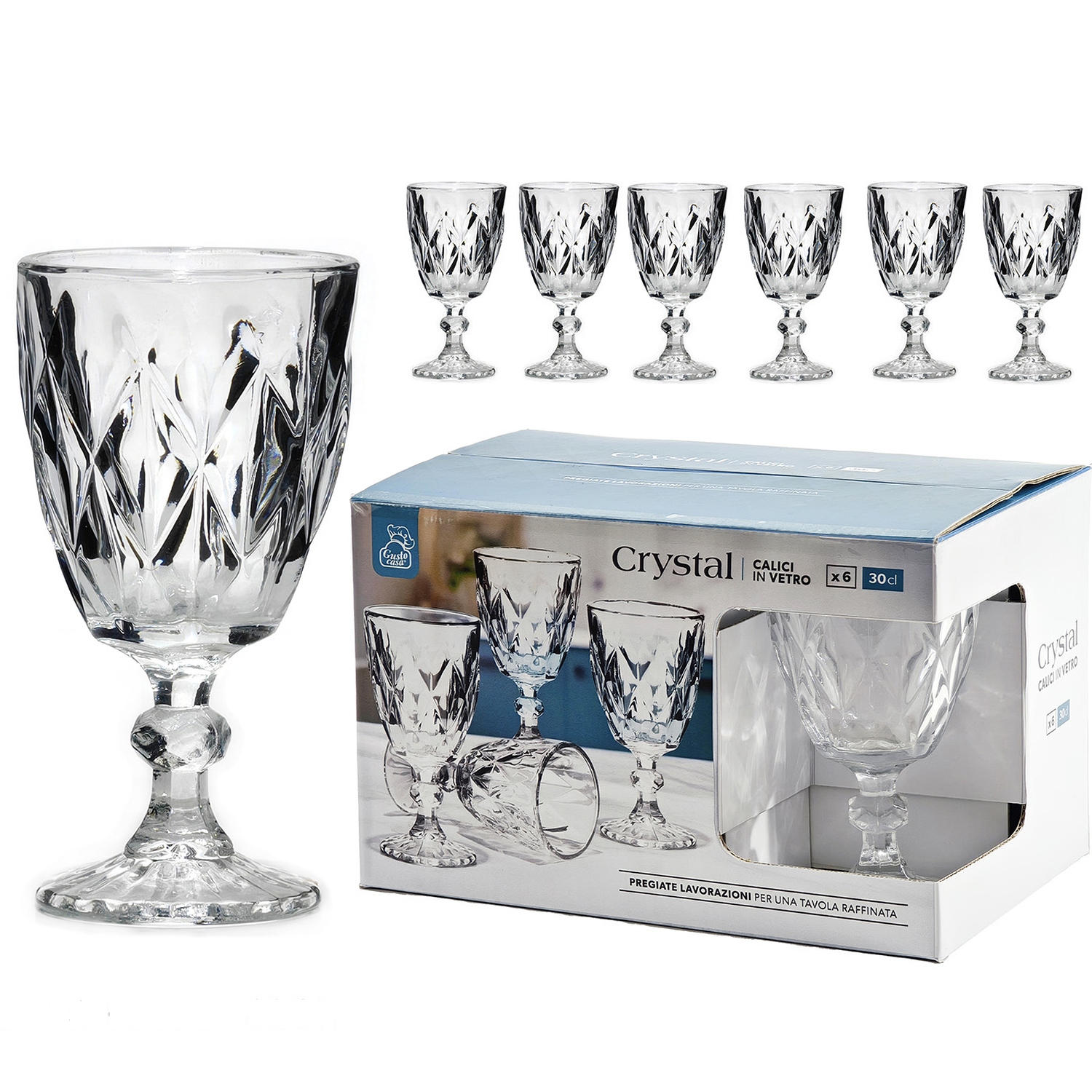 Σετ από έξι διάφανα ποτήρια Crystal, κατασκευασμένα από ανθεκτικό γυαλί, με χωρητικότητα 30cl. Ιδανικά για κάθε περίσταση.