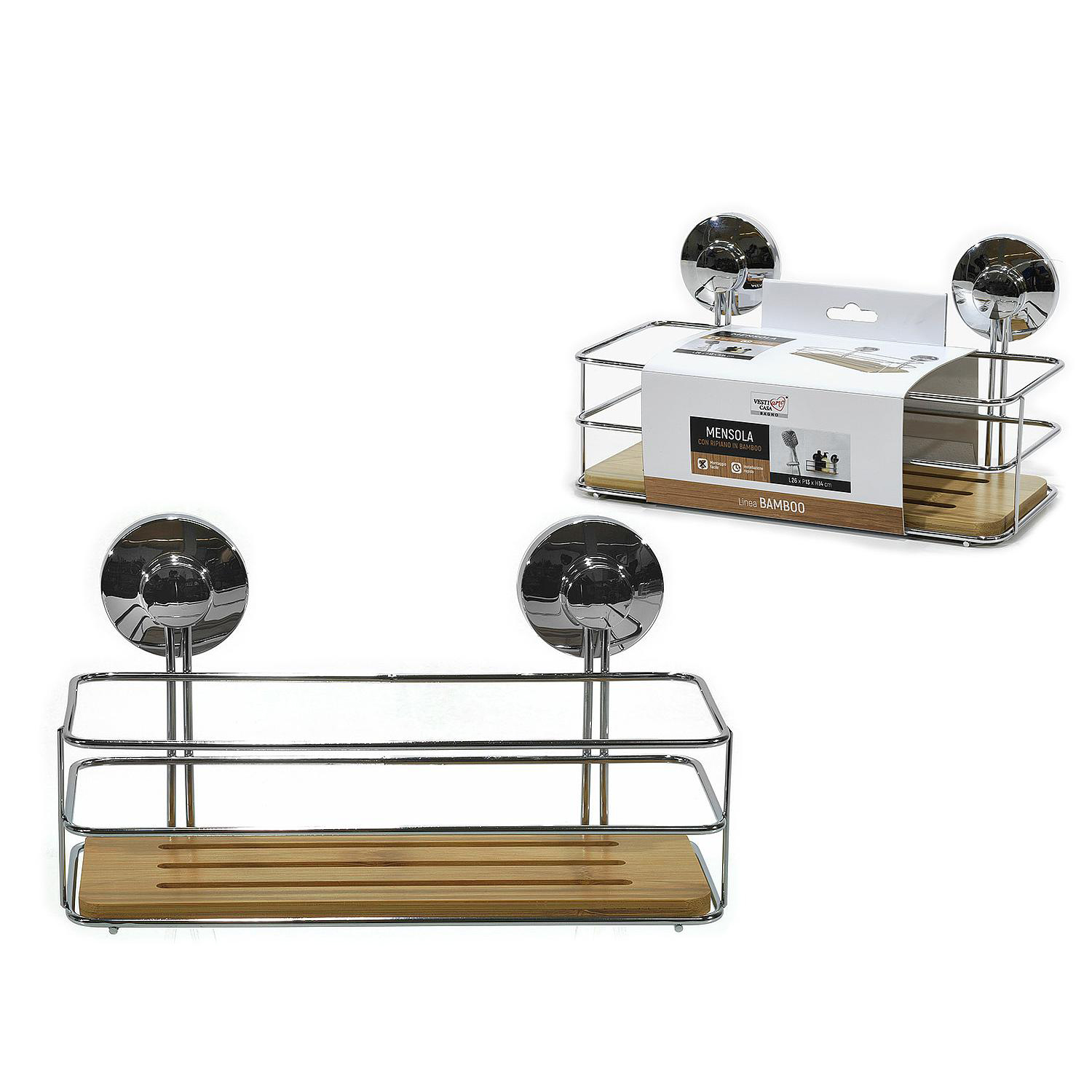 Ράφι μπάνιου με βεντούζες ασημί/φυσικό μέταλλο/μπαμπού 26x13x14cm.