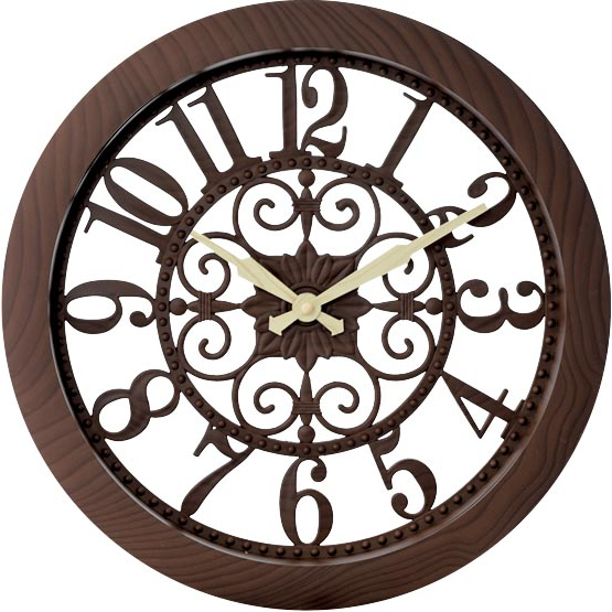 Ρολόι τοίχου στρογγυλό σε κλασικό διαχρονικό στυλ με περίτεχνο σχέδιο στο κέντρο σε καφέ χρώμα.