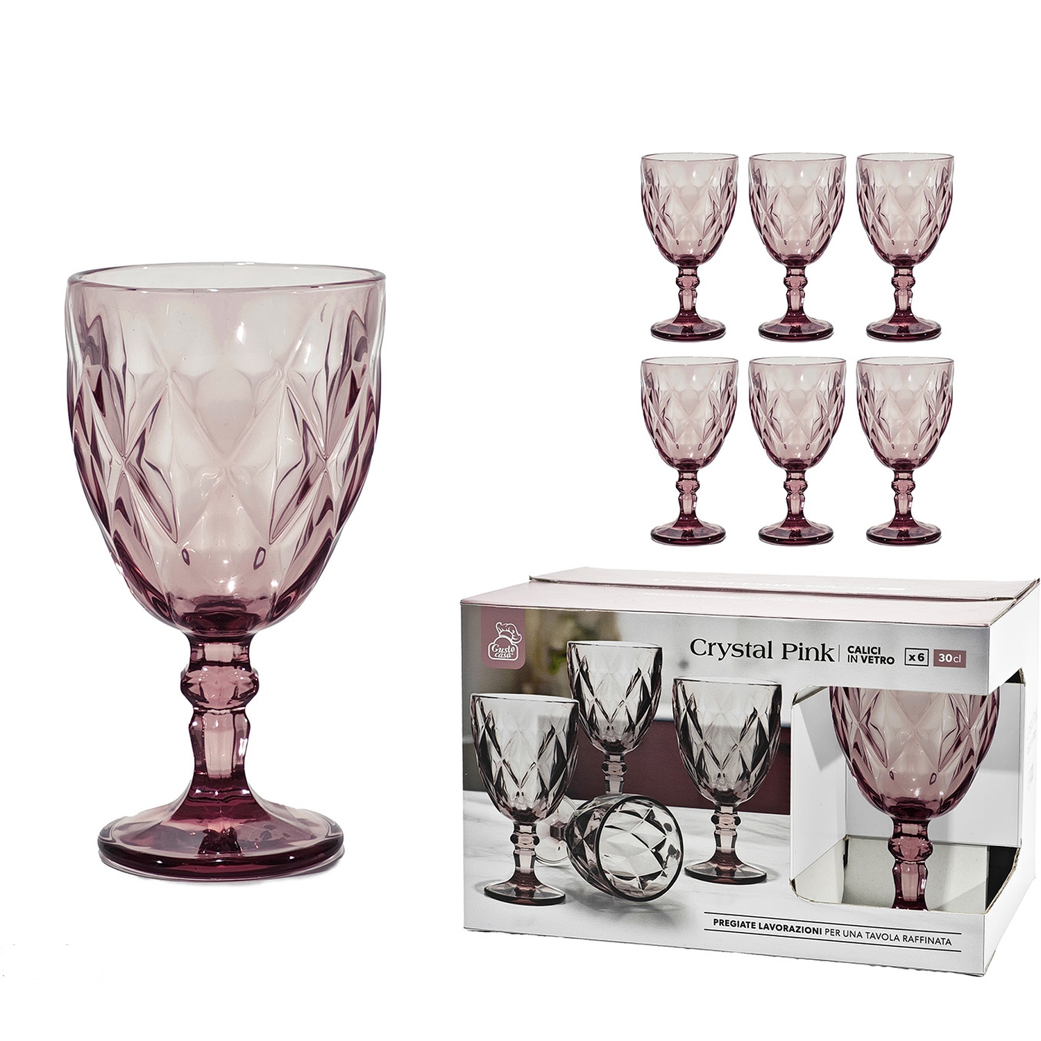 Αυτό το σετ περιλαμβάνει έξι κρυστάλλινα ποτήρια σε ροζ απόχρωση, ιδανικά για την κομψή διακόσμηση του τραπεζιού σας.