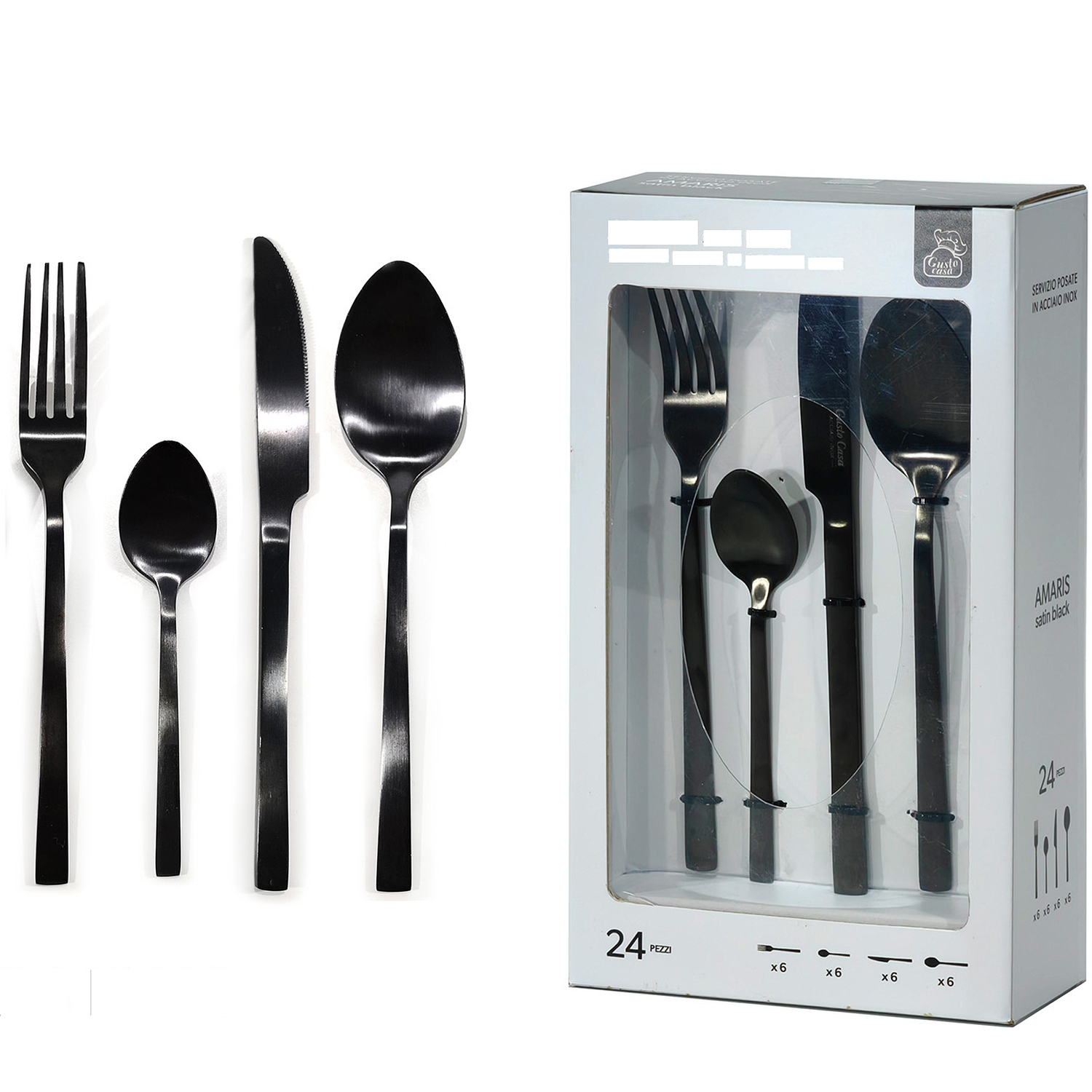 Επαγγελματικό σετ μαχαιροπίρουνα από ανοξείδωτο ατσάλι σε μαύρο ματ χρώμα. Περιλαμβάνει 24 τεμάχια, ιδανικό για κάθε γεύμα.