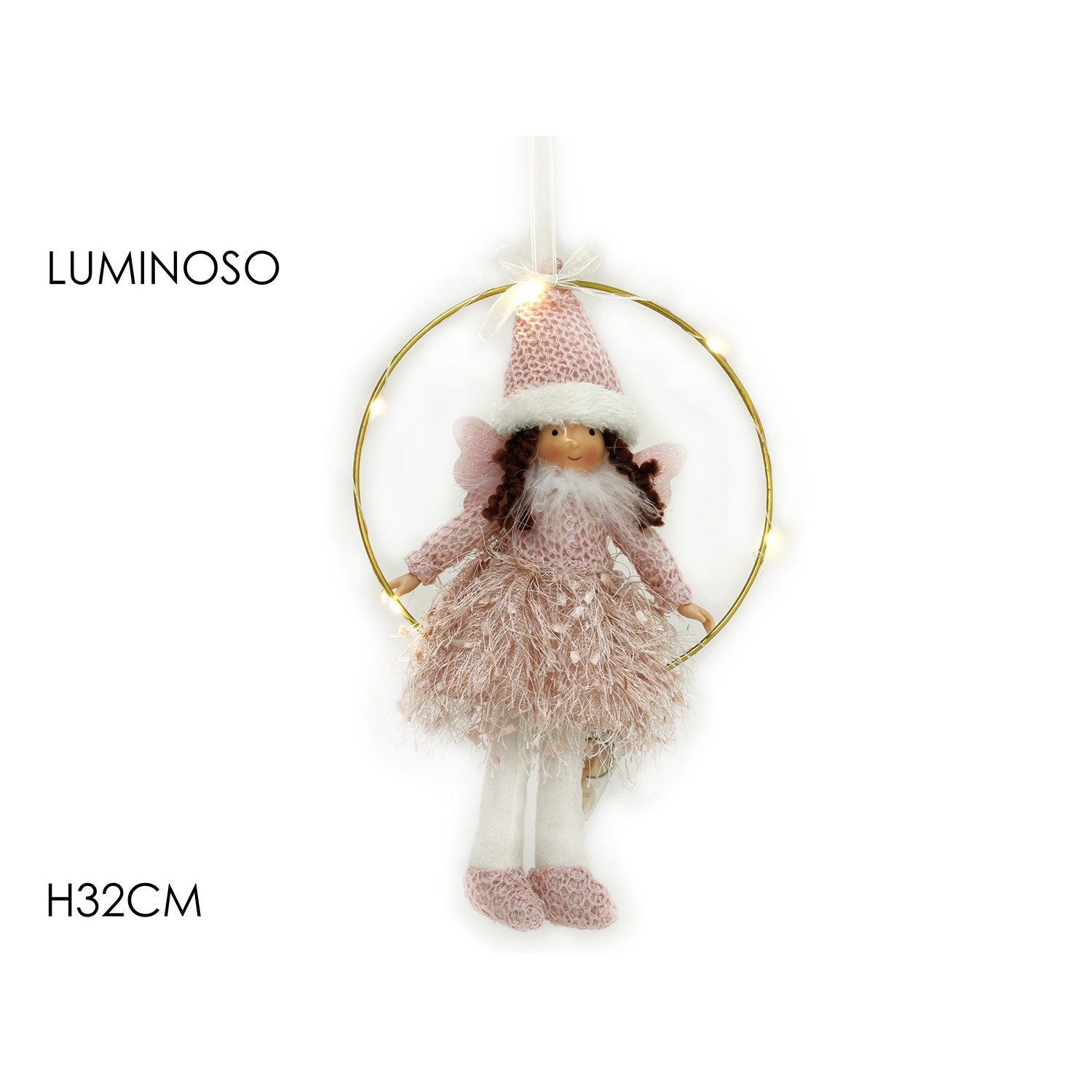 Στολίδι κρεμαστό στεφάνι με άγγελο ροζ/χρυσό μέταλλο/λούτρινο 32cm.
