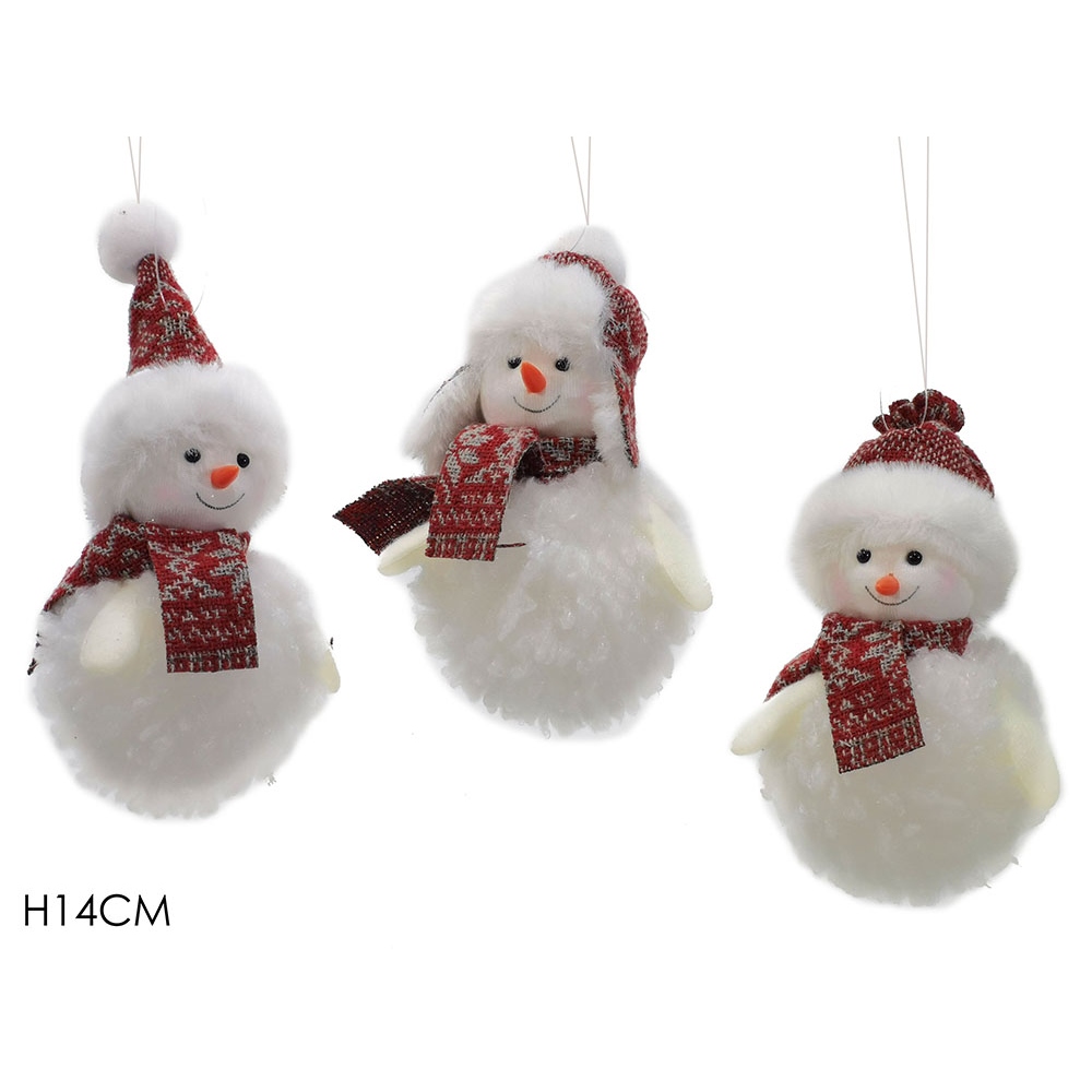 Στολίδι κρεμαστό χιονάνθρωπος λευκό λούτρινο 14cm σε 3 σχέδια.