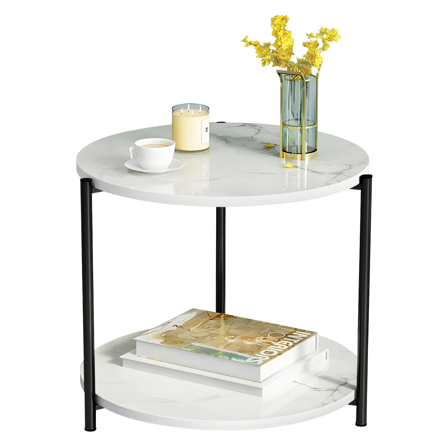- Επιφάνειες Δύο Επιπέδων: Διαθέτει δύο κυκλικές επιφάνειες κατασκευασμένες από υψηλής ποιότητας και εξαιρετικά ανθεκτικό MDF, πάχους 12mm. Η άνω επιφάνεια ξεχωρίζει για την εκλεπτυσμένη όψη λευκού μαρμάρου με λεπτές γκρίζες φλέβες, προσδίδοντας μια αίσθηση διακριτικής πολυτέλειας. Η δεύτερη επιφάνεια στη βάση προσφέρει επιπλέον χώρο αποθήκευσης, ιδανικό για περιοδικά, τηλεχειριστήρια ή διακοσμητικά καλάθια.