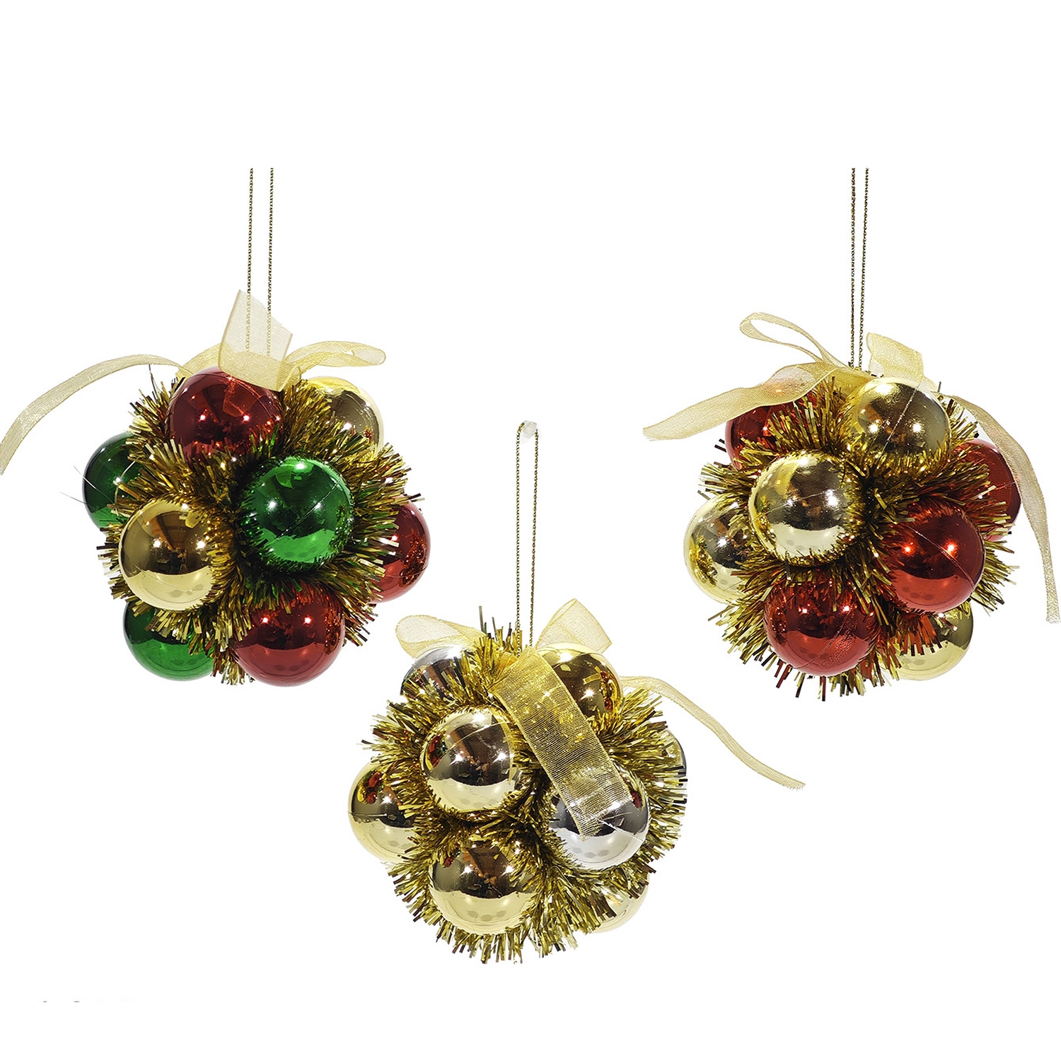 Εμπλουτίστε το χριστουγεννιάτικο δέντρο σας με αυτές τις εντυπωσιακές μπάλες σε κόκκινο, χρυσό και πράσινο. είναι διαθέσιμο σε τρία διαφορετικά σχέδια, προσφέροντας ποικιλία και στυλ στη διακόσμησή σας. Κάθε μπάλα είναι διακοσμημένη με κορδέλα και γιρλάντα, προσδίδοντας επιπλέον λάμψη και γιορτινή αίσθηση.