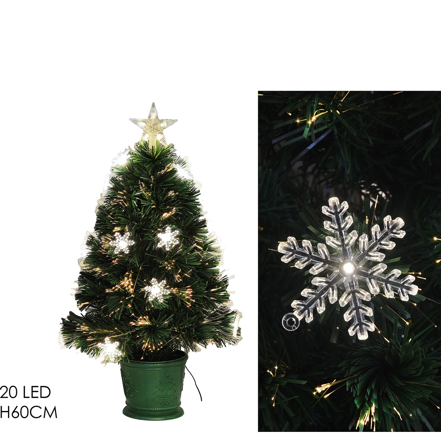 Φέρτε τη μαγεία των Χριστουγέννων στο σπίτι σας με αυτό το φωτεινό χριστουγεννιάτικο δέντρο οπτικών ινών. Με ύψος 60cm, διαθέτει 20 LED φώτα και εφέ χιονιού που προσθέτουν μια λαμπερή και γιορτινή αίσθηση. Ιδανικό για μικρούς χώρους, αυτό το δέντρο προσφέρει μια ζεστή και χαρούμενη ατμόσφαιρα.