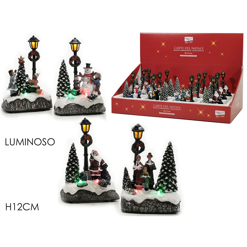 Χριστουγεννιάτικο σκηνικό φιγούρες δίπλα σε στύλο και δέντρο φωτιζόμενο πολύχρωμο polyresin 12cm σε 4 σχέδια.