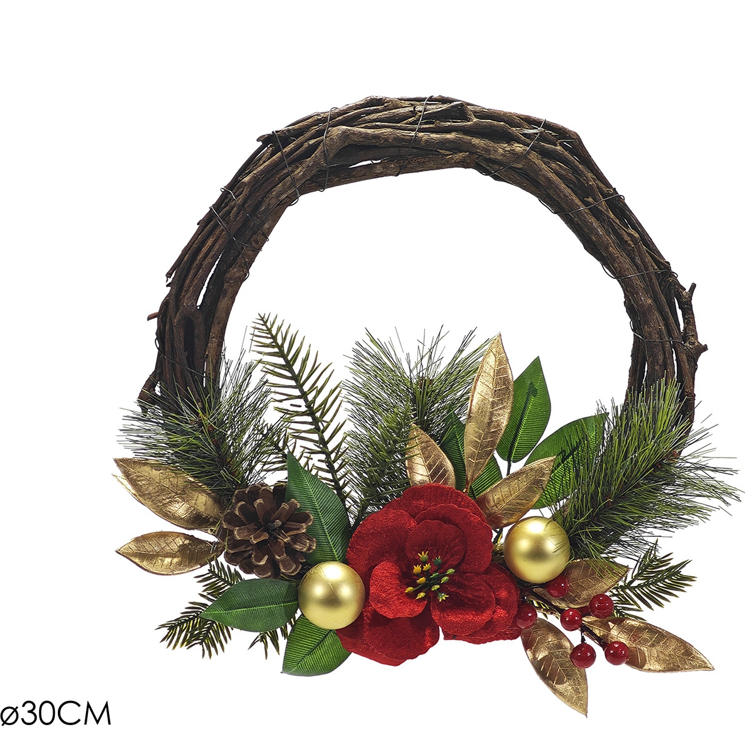 Προσθέστε μια πολυτελή και γιορτινή πινελιά στη διακόσμησή σας με αυτό το χριστουγεννιάτικο στεφάνι. Με διάμετρο 30cm και διακοσμημένο με κουκουνάρια, berries και χρυσές λεπτομέρειες, αυτό το στεφάνι είναι ιδανικό για να στολίσετε πόρτες ή τοίχους. Προσφέρει μια λαμπερή και γιορτινή αίσθηση στον χώρο σας.