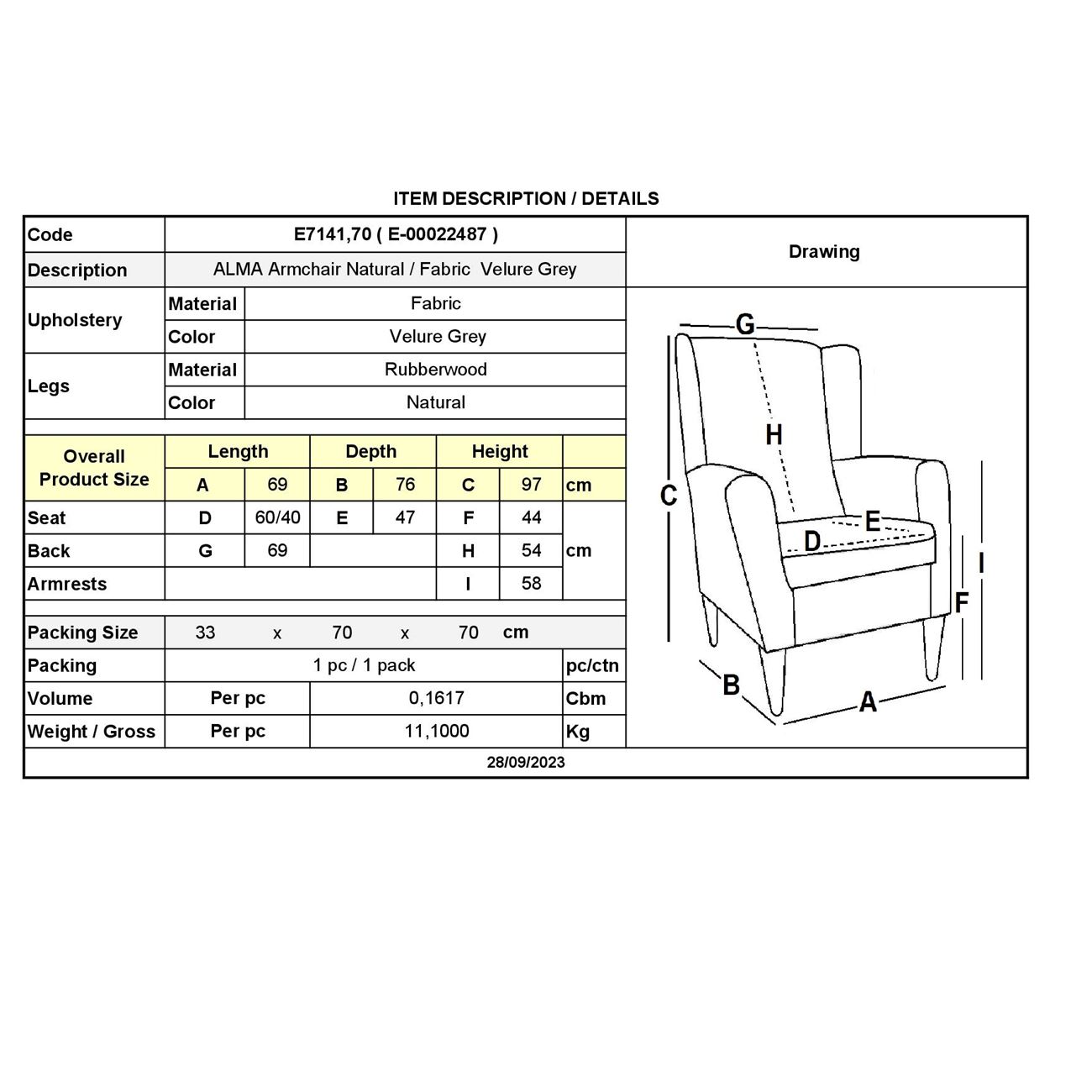 ALMA Πολυθρόνα – Μπερζέρα Σαλονιού – Καθιστικού Φυσικό Ύφασμα Velure Γκρι, K/D
