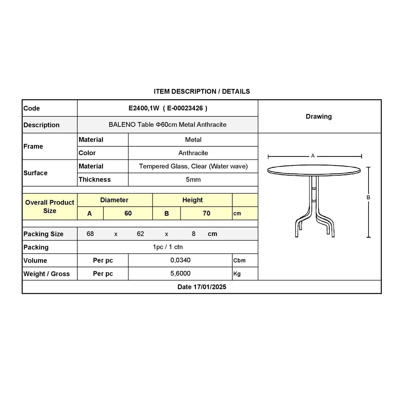 BALENO Τραπέζι Κήπου – Βεράντας, Μέταλλο Βαφή Ανθρακί, Γυαλί Tempered