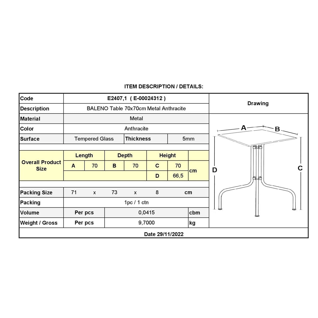 Ε2407,1 BALENO Τραπέζι 70x70cm Μέταλλο Ανθρακί/Γυαλί