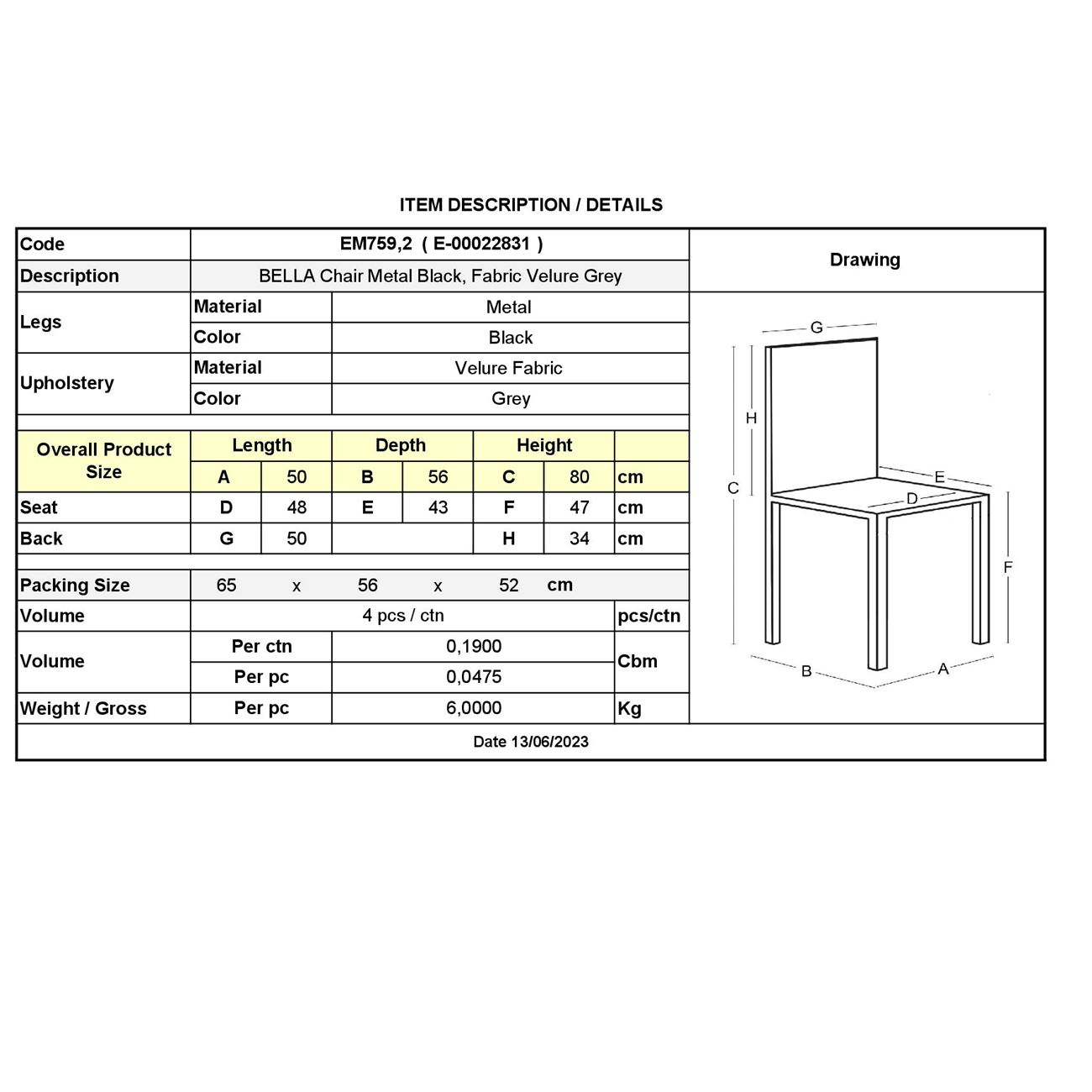 ΕΜ759,2 BELLA Καρέκλα Μέταλλο Μαύρο/Ύφασμα Velure Γκρι