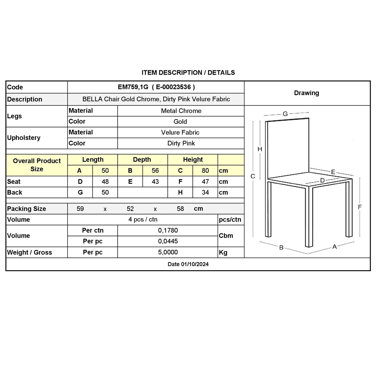 ΕΜ759,1G BELLA Καρέκλα Χρώμιο Χρυσό/Ύφασμα Velure Dirty Pink