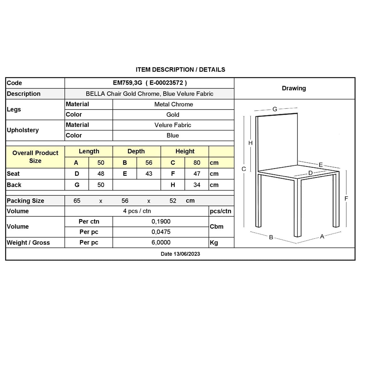 ΕΜ759,3G BELLA Καρέκλα Χρώμιο Χρυσό/Ύφασμα Velure Μπλε