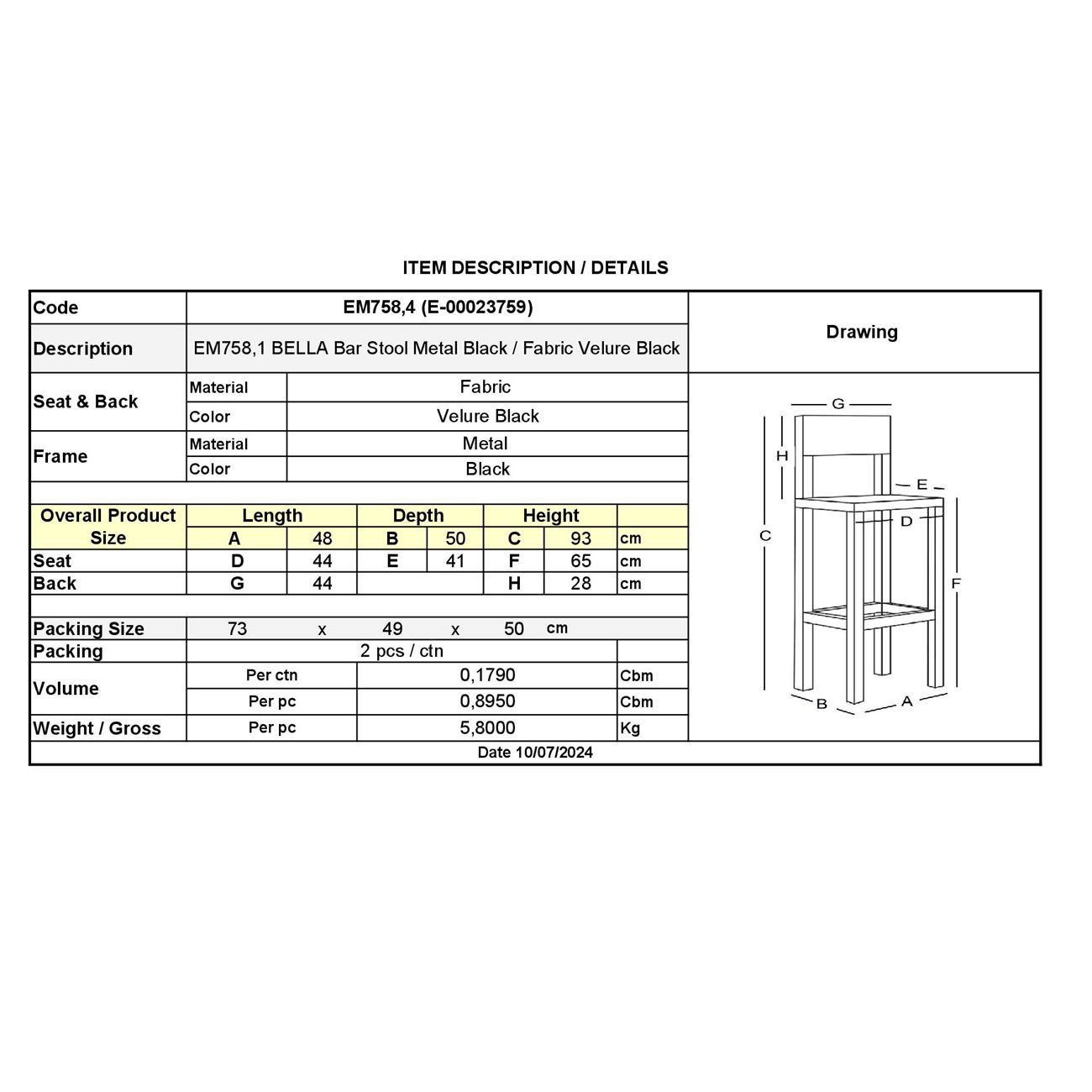 ΕΜ758,4 BELLA Σκαμπό BAR Μεταλ.Μαύρο/Ύφασμα Velure Μαύρο