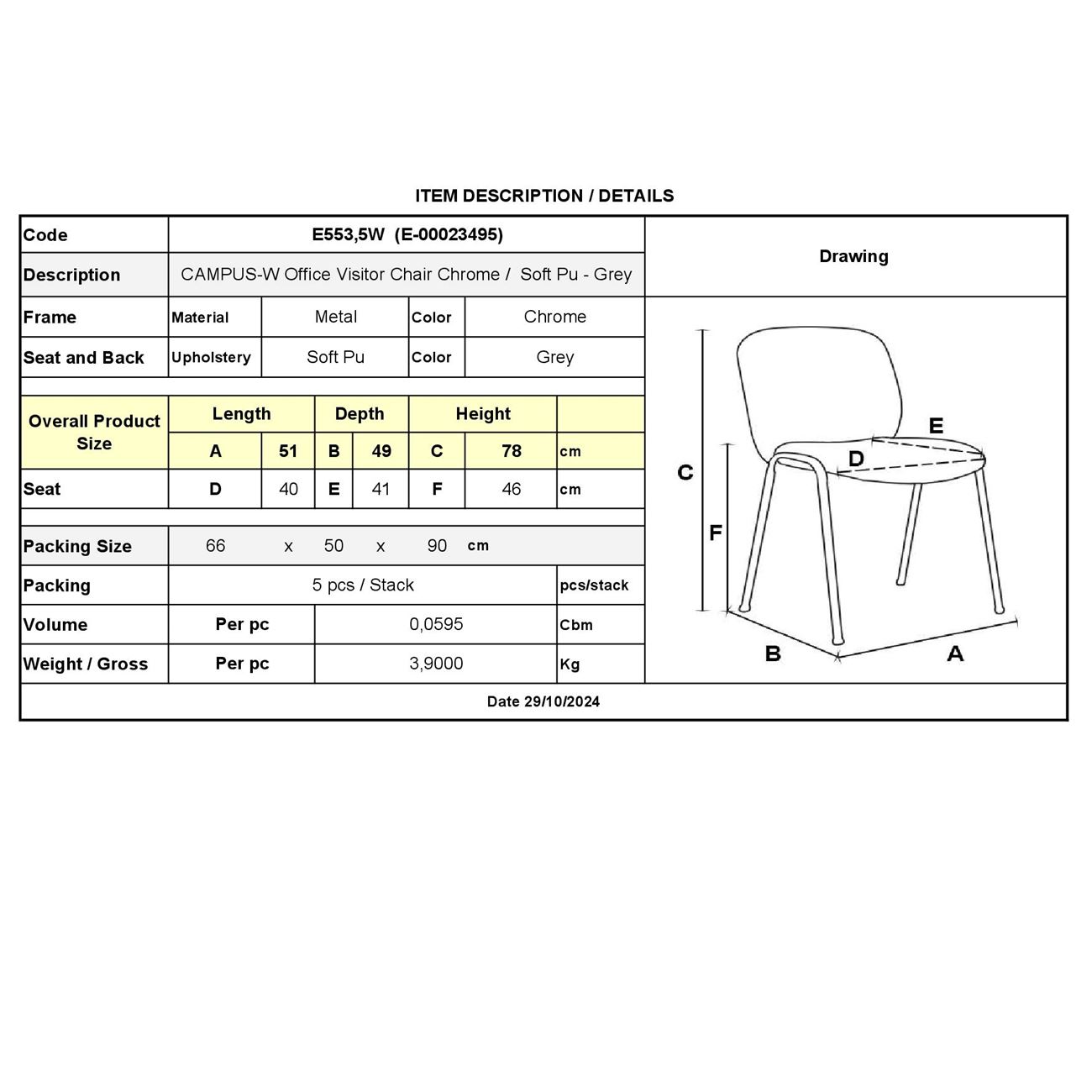 CAMPUS Καρέκλα Επισκέπτη Γραφείου, Στοιβαζόμενη Χρώμιο Μέταλλο, Soft Pu Γκρι