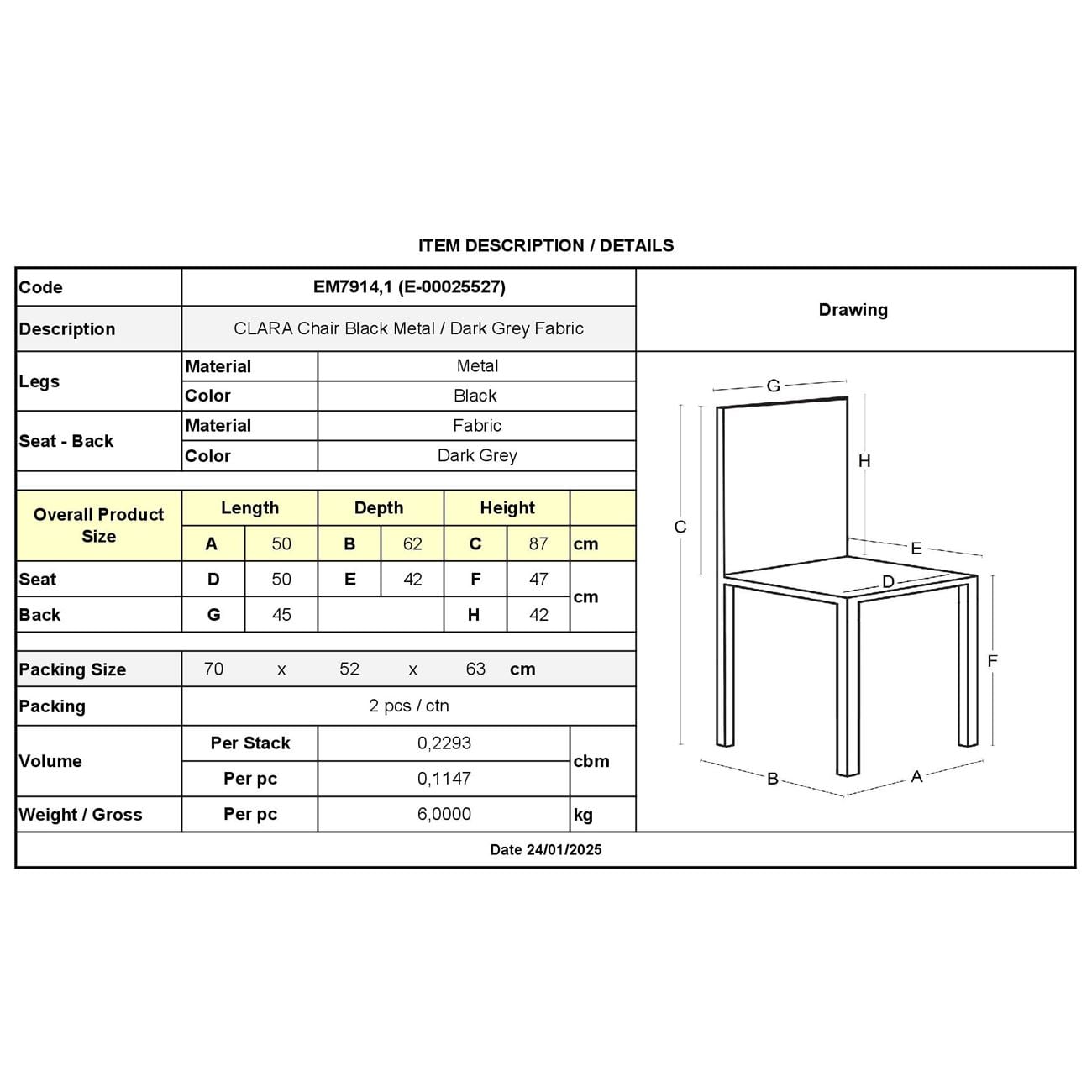 CLARA Καρέκλα Τραπεζαρίας Μέταλλο Βαφή Μαύρο, Ύφασμα Σκούρο Γκρι