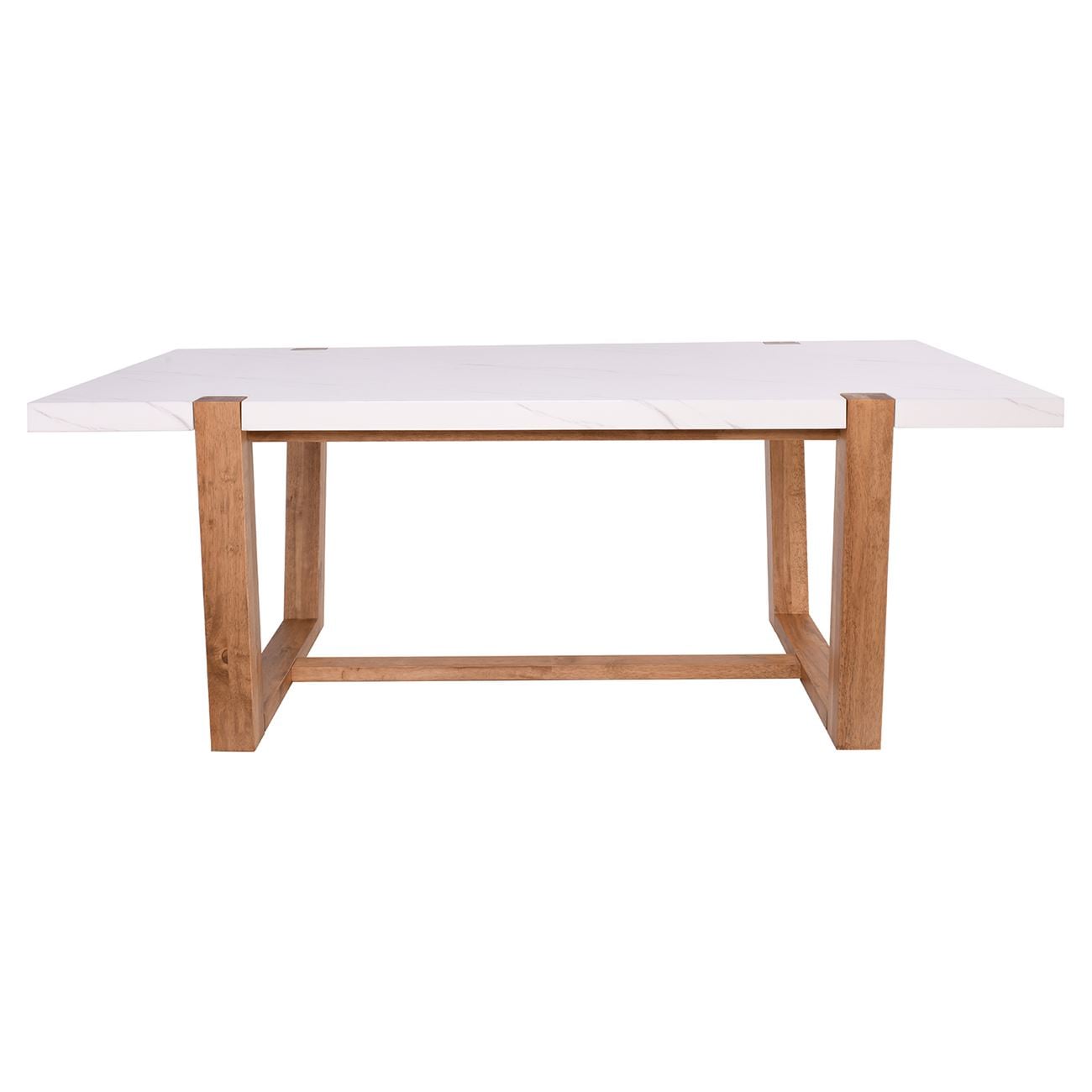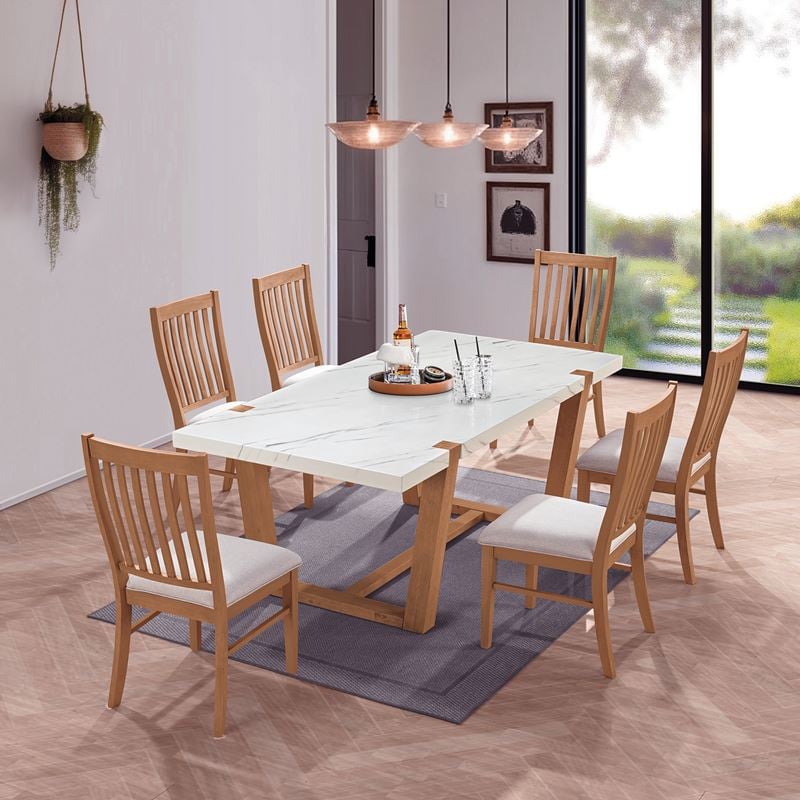 COMET Set Τραπεζαρία Ξύλινη: Τραπέζι+6 Καρέκλες, Φυσικό με Mdf Άσπρο Μάρμαρο,Ύφασμα Άσπρο