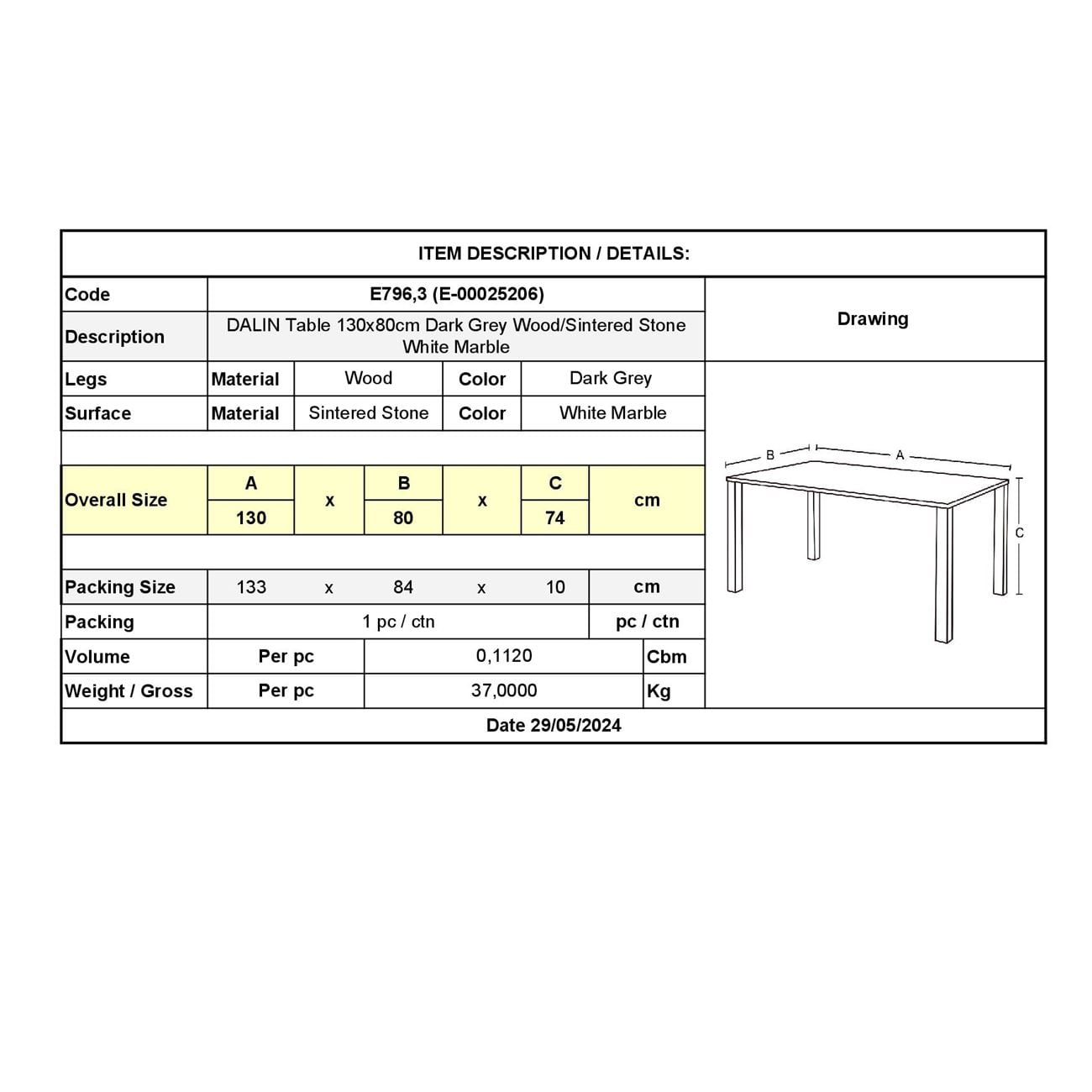 Ε796,3 DALIN Τραπέζι 130x80cm Ξύλο Σκ.Γκρι/Sintered Stone White Marble