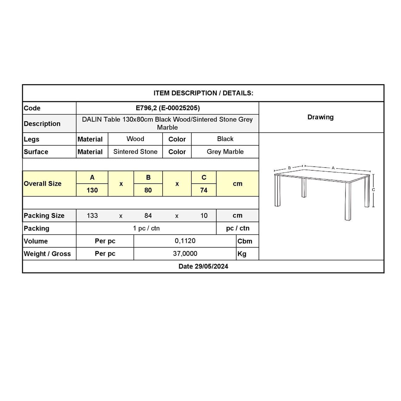 Ε796,2 DALIN Τραπέζι 130x80cm Ξύλο Μαύρο/Sintered Stone Grey Marble