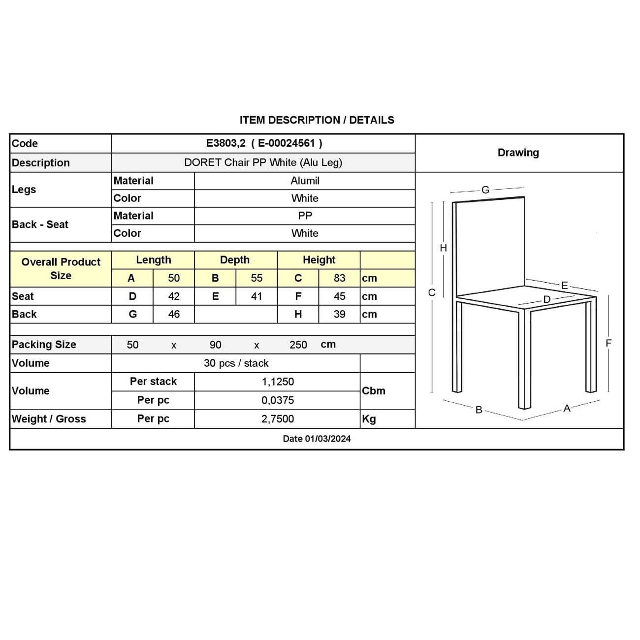 DORET Καρέκλα Στοιβαζόμενη PP Άσπρο, με πόδι αλουμινίου