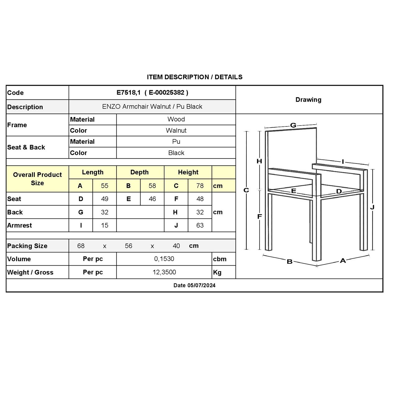 ENZO Πολυθρόνα Τραπεζαρίας Καρυδί, Pu Μαύρο