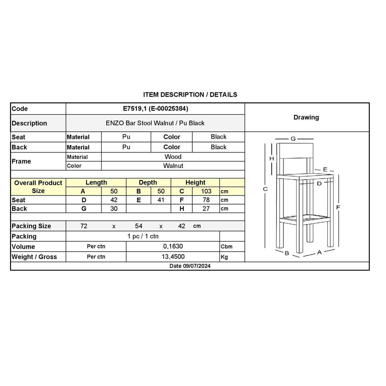 ENZO Σκαμπό Bar Καρυδί, Pu Μαύρο