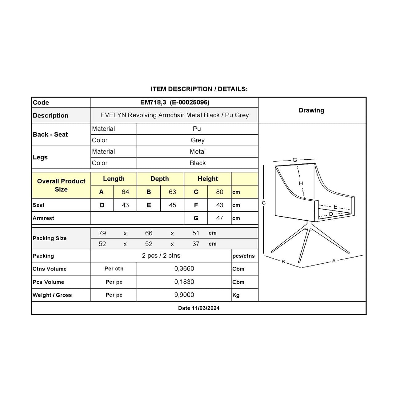 EVELYN Πολυθρόνα Περιστρεφόμενη, Μέταλλο Βαφή Μαύρο, Pu Γκρι-Μπεζ