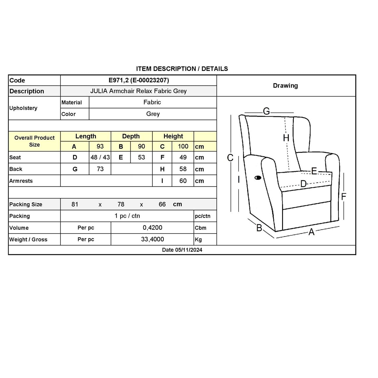 JULIA Πολυθρόνα Relax Σαλονιού – Καθιστικού, Ύφασμα Γκρι