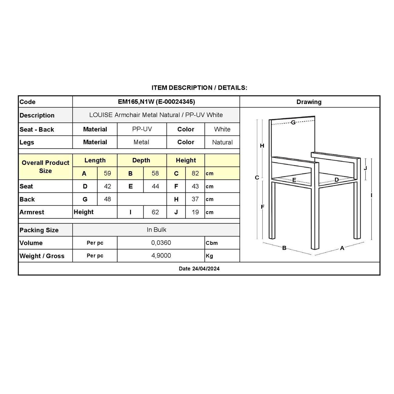 LOUISE Πολυθρόνα Μέταλλο Βαφή Φυσικό, PP-UV Άσπρο (εκτός συσκευασίας)