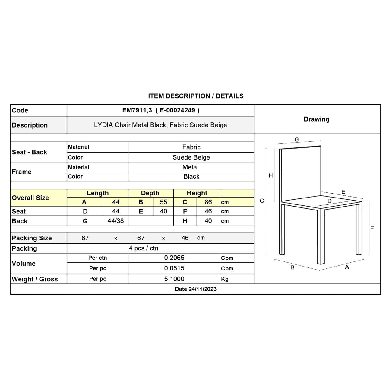 ΕΜ7911,3 LYDIA Καρέκλα Μέταλ.Μαύρο/Ύφασμα Suede Μπεζ