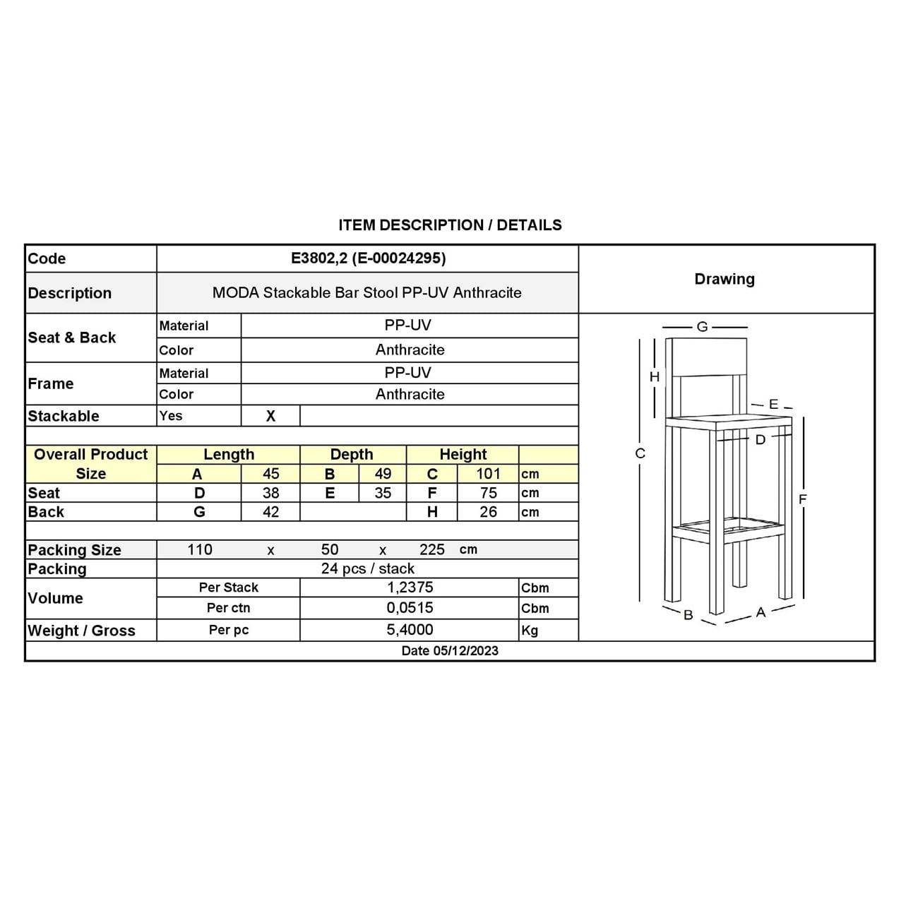 Ε3802,2 MODA Σκαμπό Bar-Pro PP-UV Ανθρακί