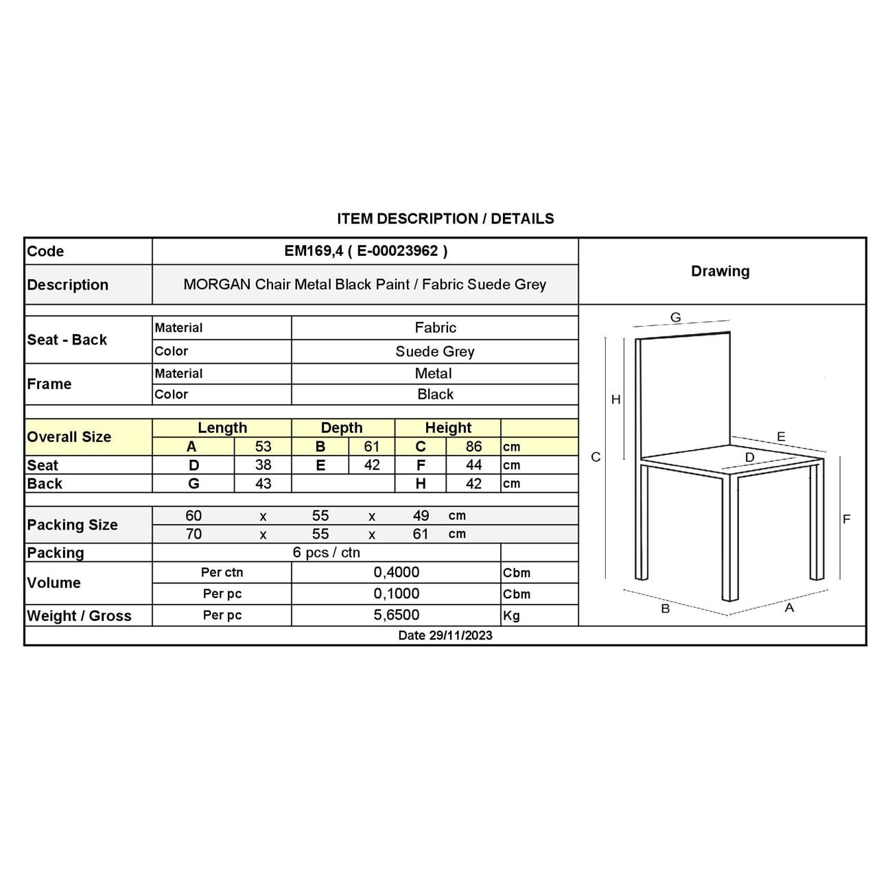 MORGAN Καρέκλα Τραπεζαρίας Σαλονιού, Μέταλλο Βαφή Μαύρο, Ύφασμα Suede Ανθρακί
