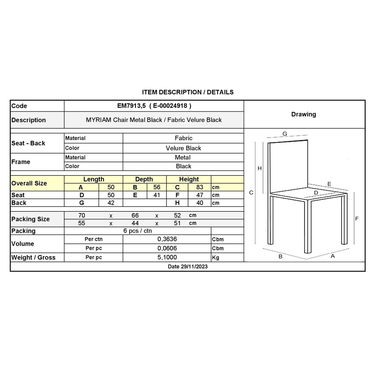 ΕΜ7913,5 MYRIAM Καρέκλα Μέταλ.Μαύρο/Ύφασμα Velure Μαύρο (Συσκ.6)